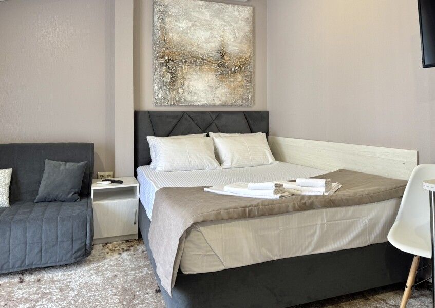 В номере есть все для комфортного проживания: полноценная кухонная зона с обеденным столом и варочной поверхностью, ванная комната, кондиционер, быстрый Wi-Fi, дополнительное спальное место, мини-холодильник, телевизор, чайник и посуда, тапочки, полотенца, фен.
