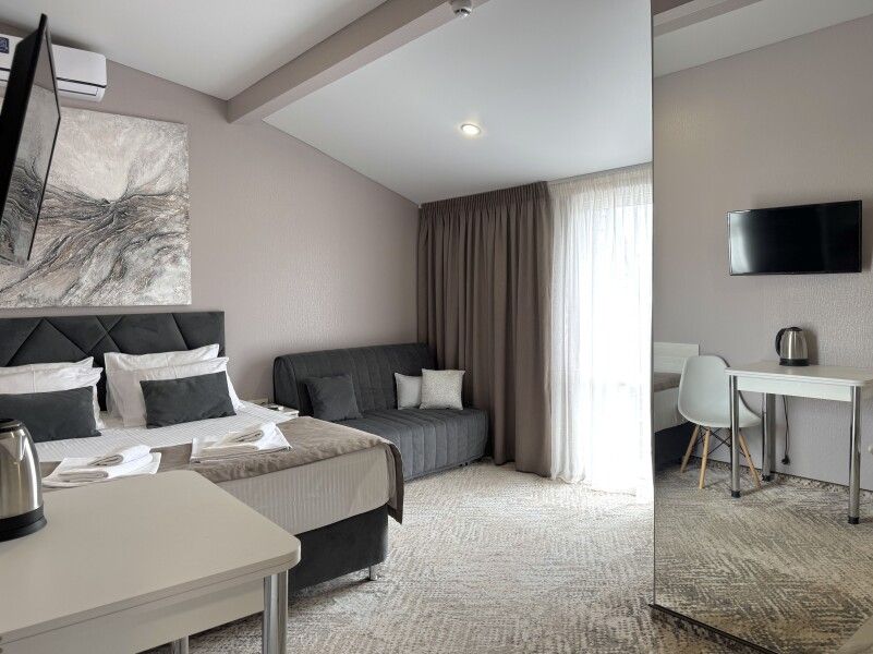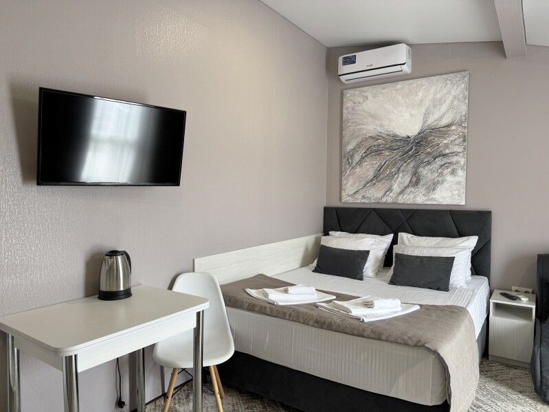 Номера категории Комфорт улучшенный расположены на 2 этаже Апарт отеля. В номере есть все для комфортного проживания: полноценная кухонная зона с обеденным столом и варочной поверхностью, ванная комната, кондиционер, быстрый Wi-Fi, дополнительное спальное место, мини-холодильник, телевизор, чайник и посуда, тапочки, полотенца, фен.