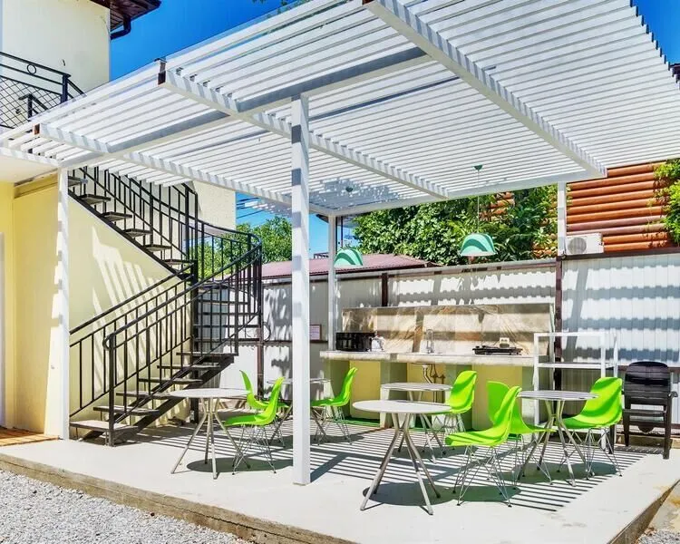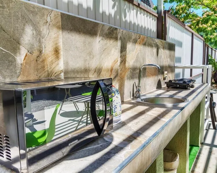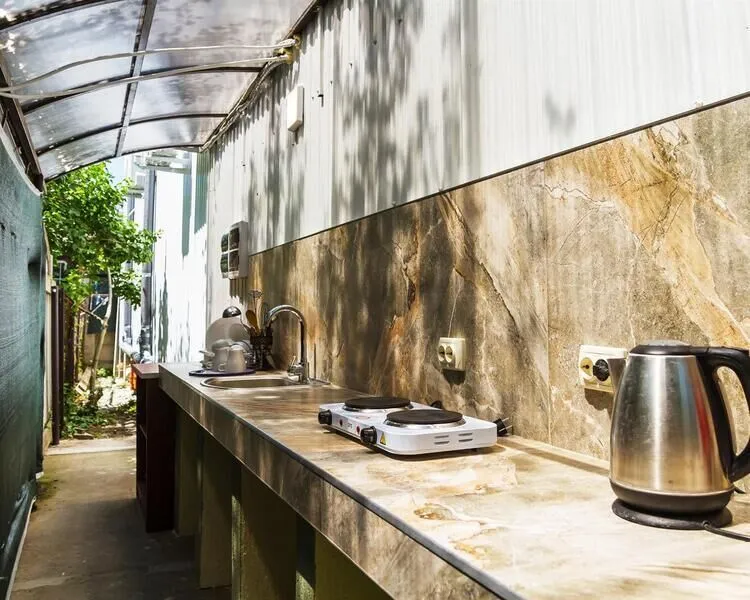 В беседке обустроена кухня с мойкой, плитой и СВЧ-печью. «Столовая №1» предлагает вкусные блюда по приемлемым ценам, она находится на расстоянии 0,3 км. Кафе «Шахерезада» в 0,2 км. Купить продукты можно в магазине «Продмаг Мангуст» в 0,3 км.