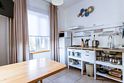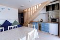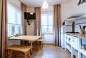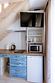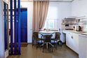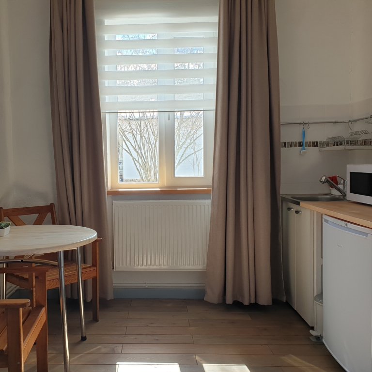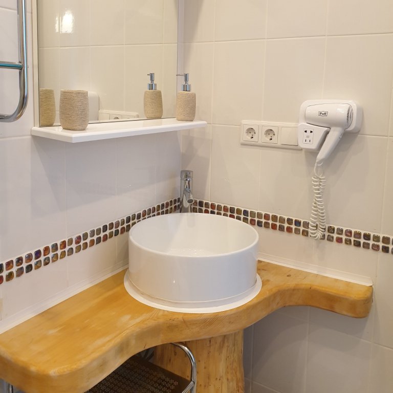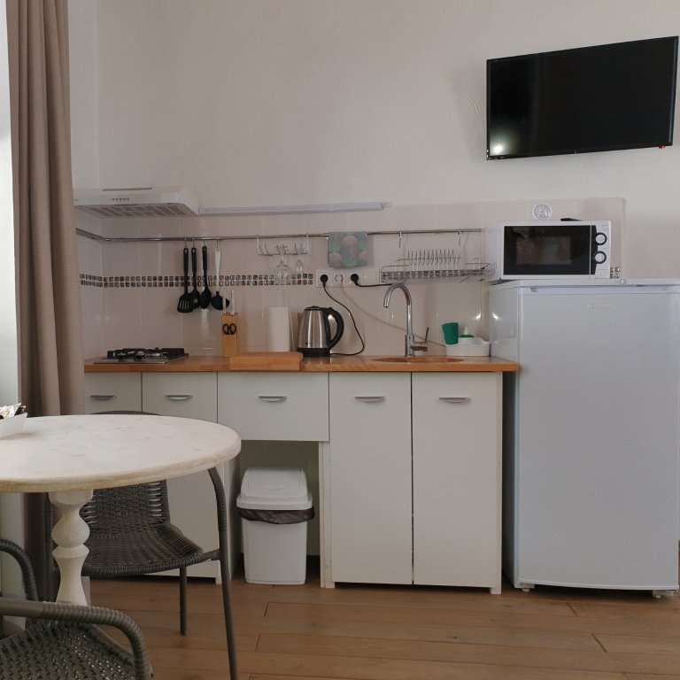 Небольшая и уютная. Кровать шириной 160 см. Можно сделать две отдельные по запросу. Дополнительное место или детская кроватка не устанавливаются. На кухне все необходимое для приготовления пищи.