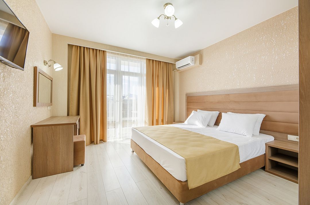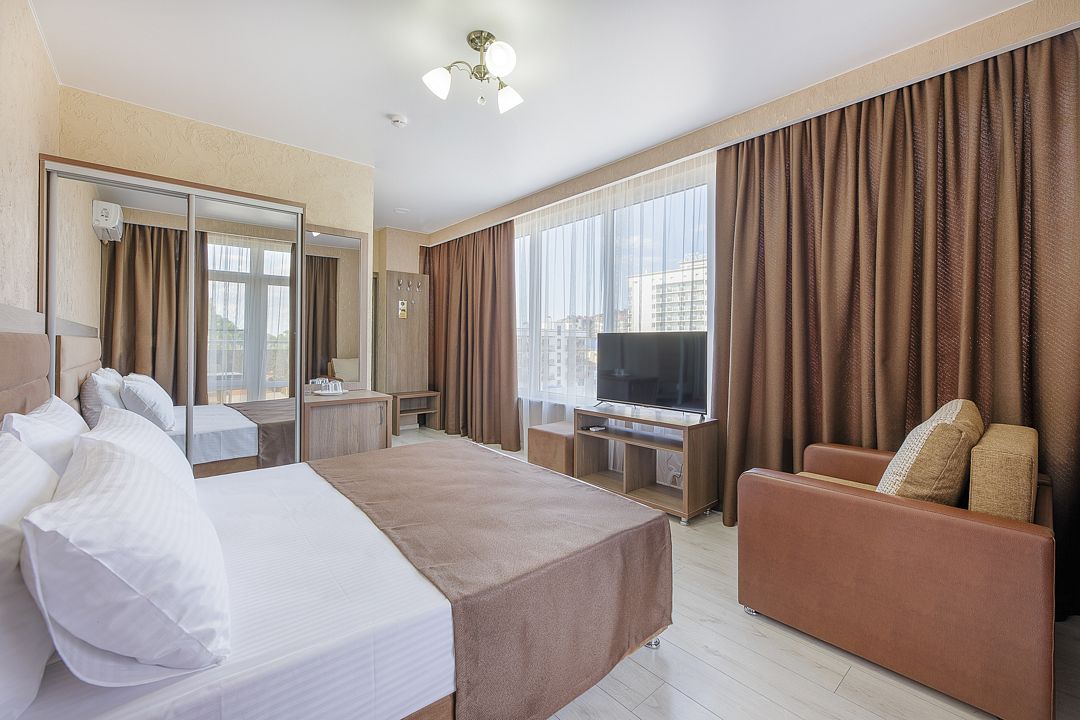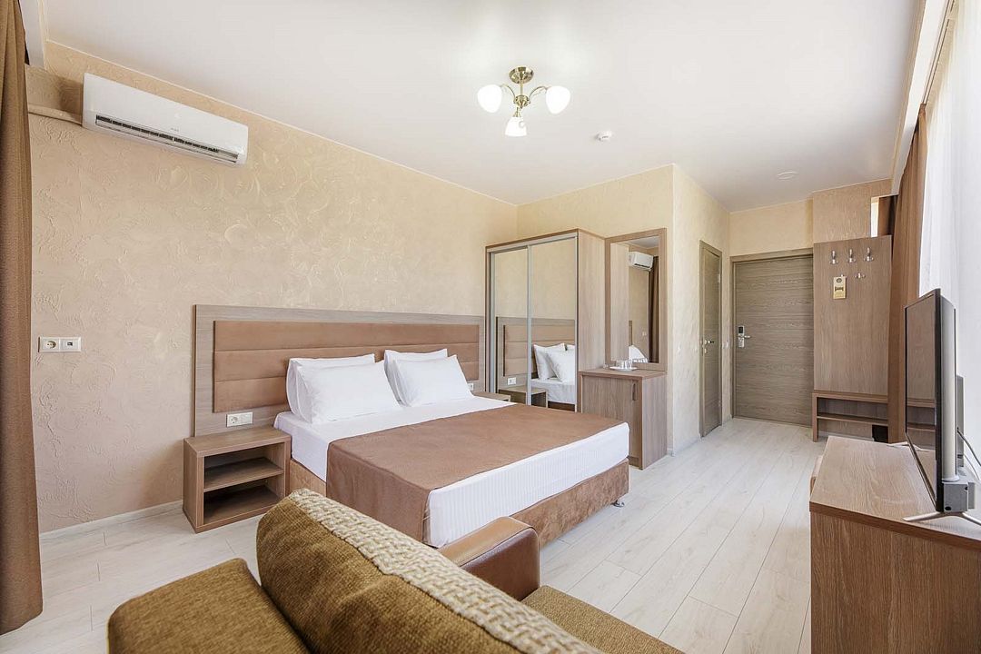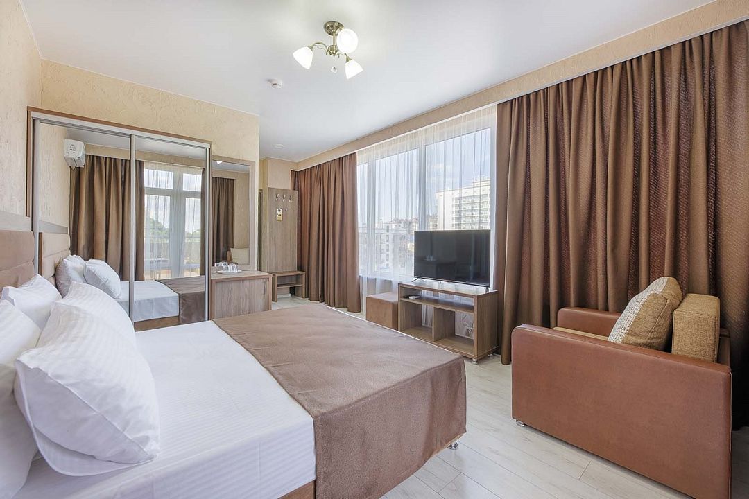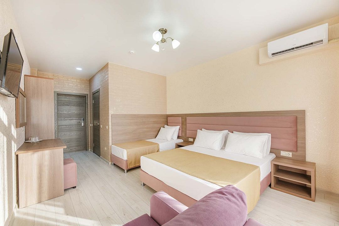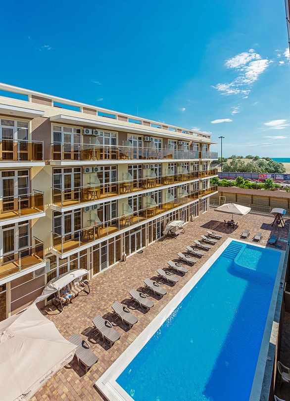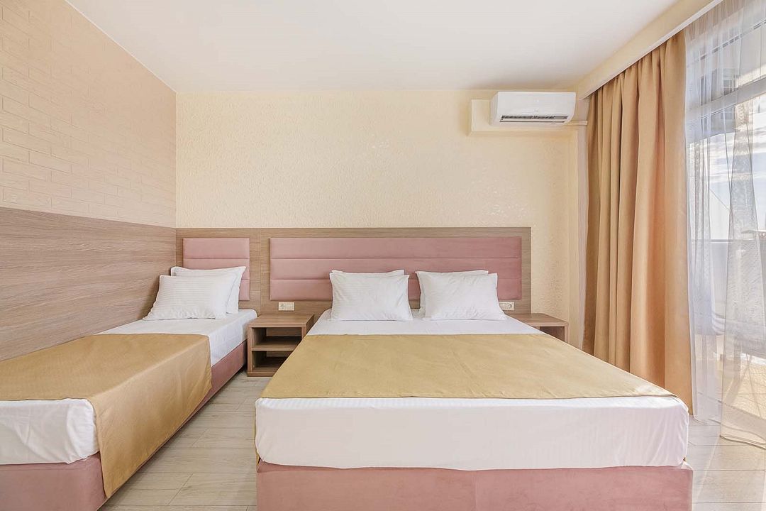 Четырехэтажный корпус отеля располагается всего в 100 метрах от моря. Однокомнатные и двухкомнатные номера с лаконичными интерьерами, выдержанными в пастельной гамме, оснащены необходимыми удобствами.