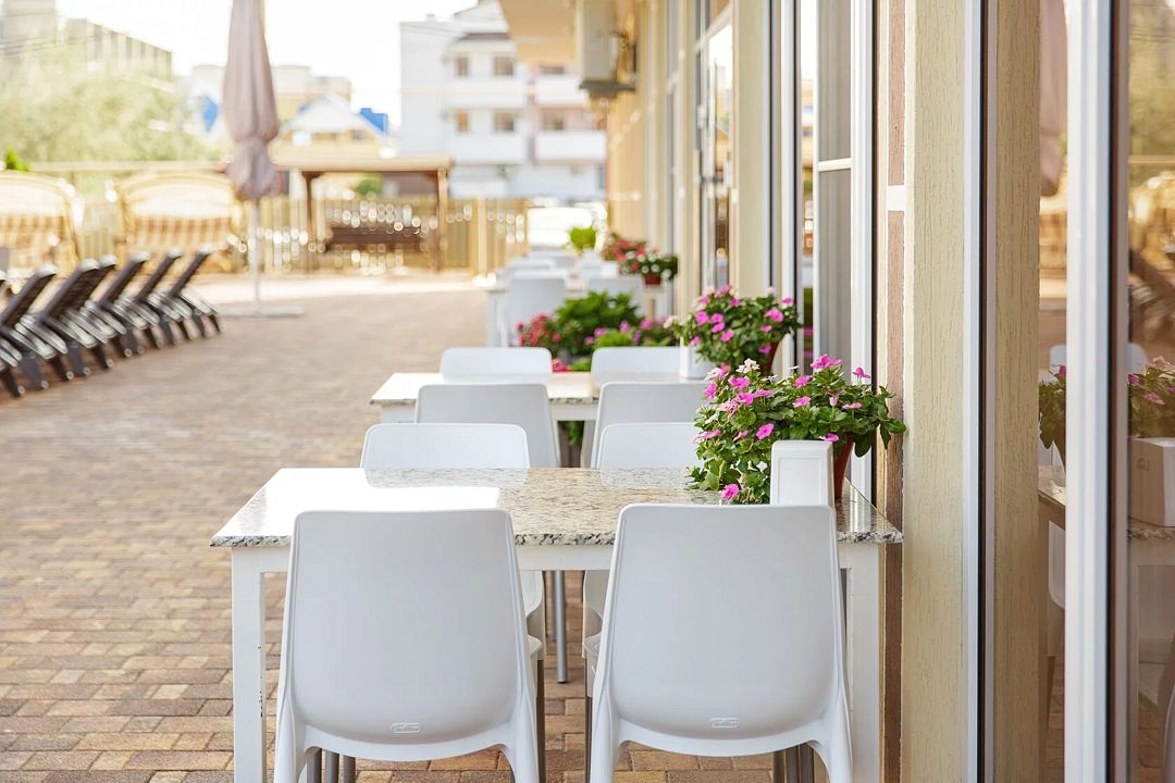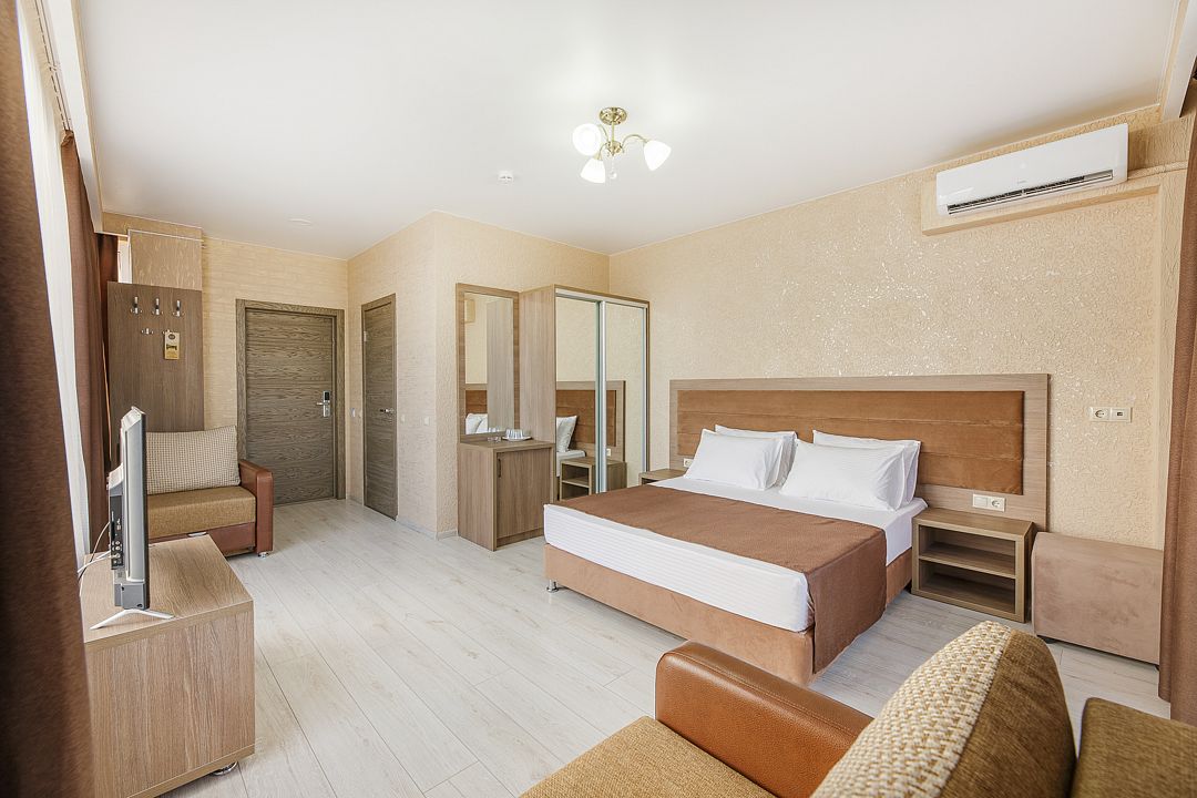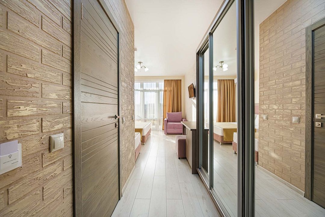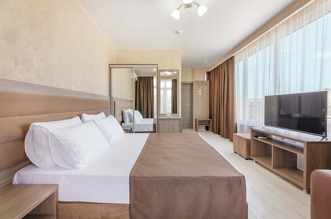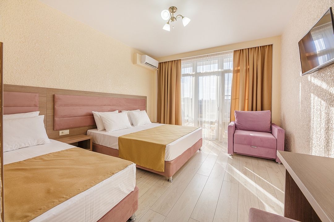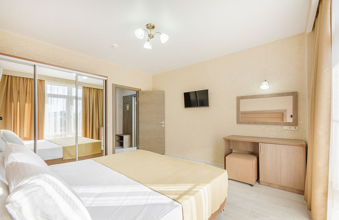 Четырехэтажный корпус отеля располагается всего в 100 метрах от моря. Однокомнатные и двухкомнатные номера с лаконичными интерьерами, выдержанными в пастельной гамме, оснащены необходимыми удобствами.