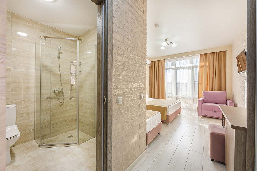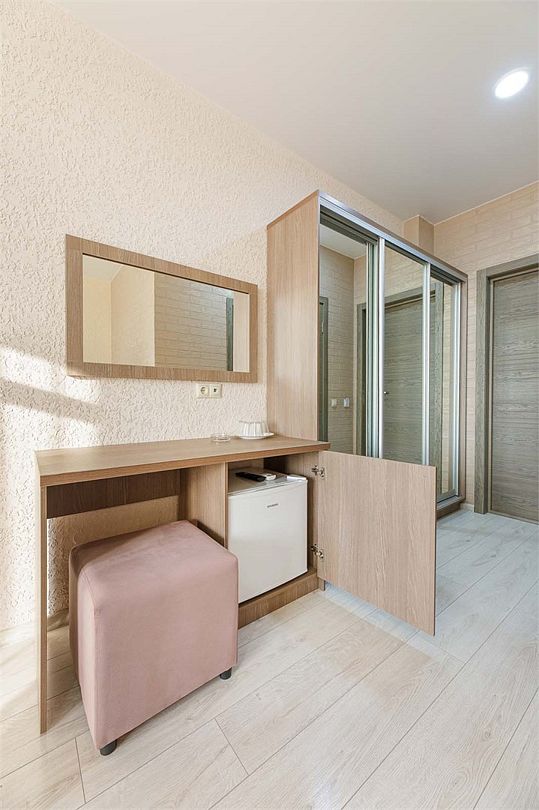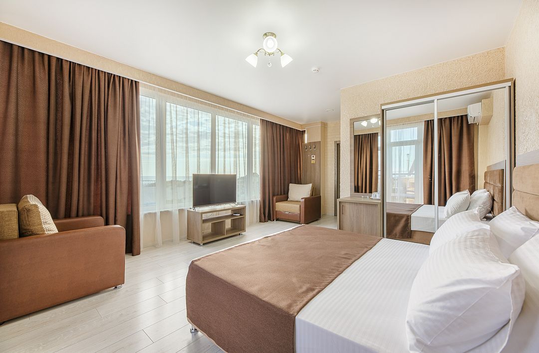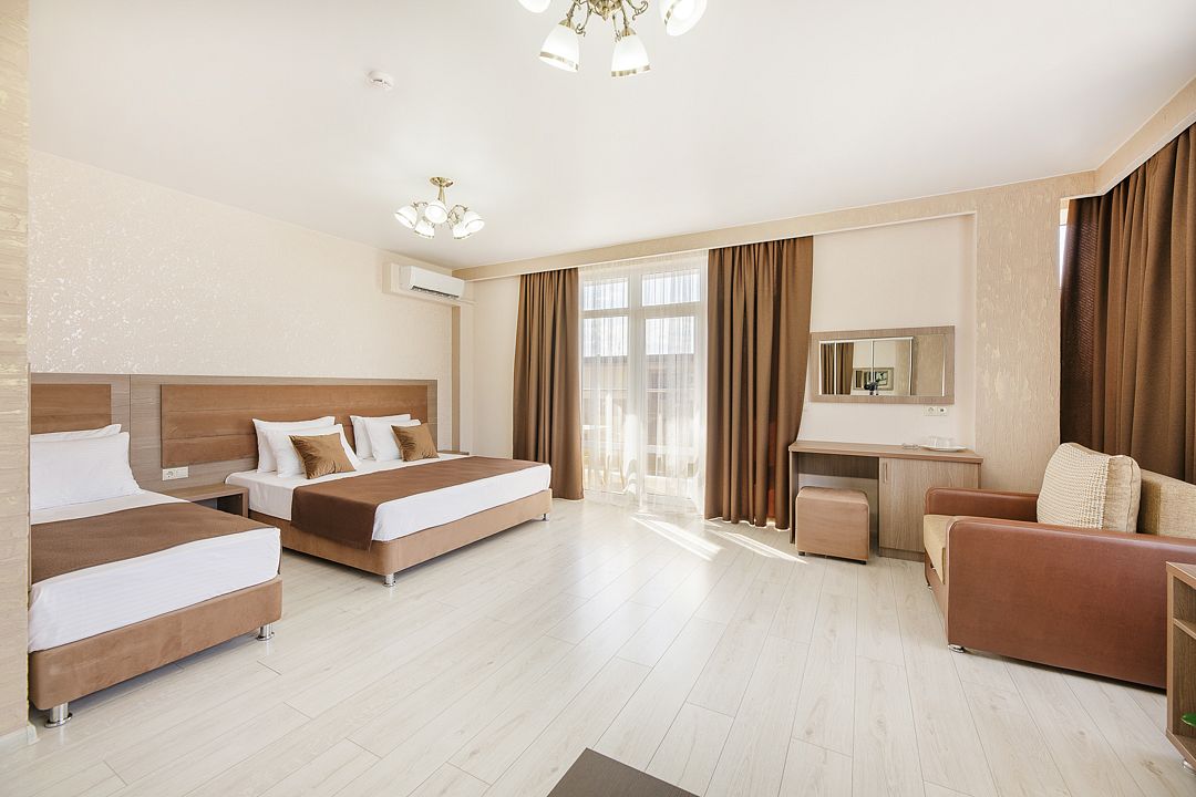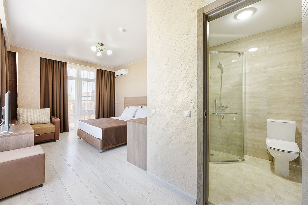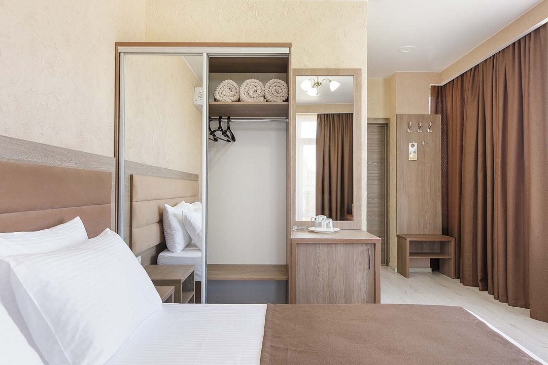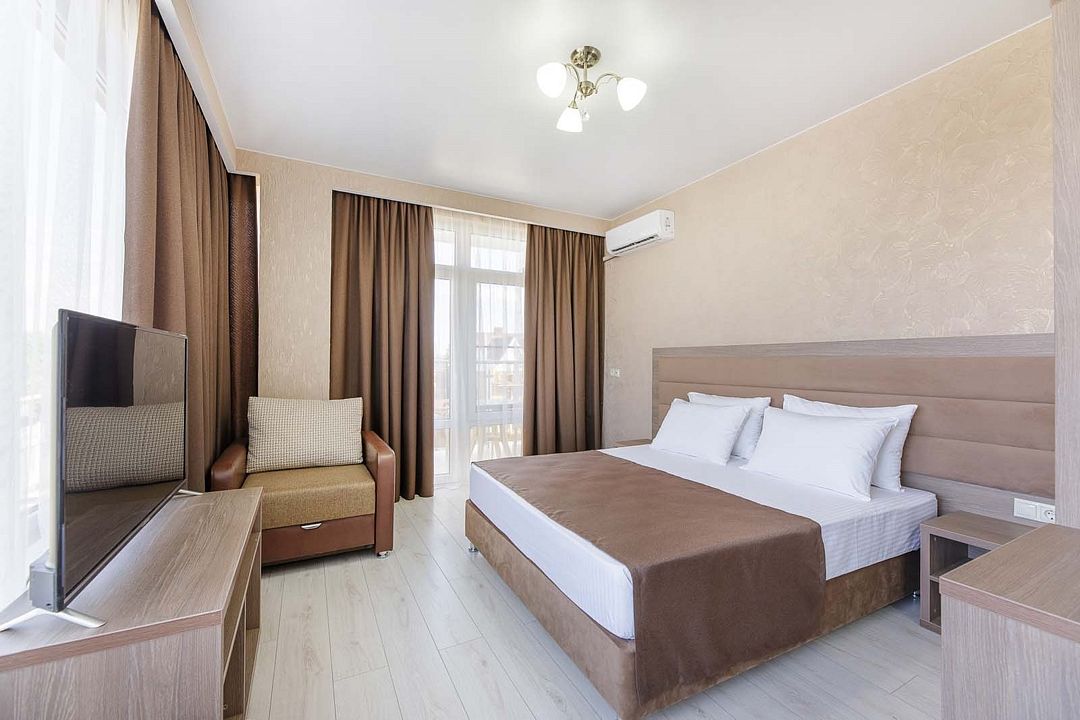 Четырехэтажный корпус отеля располагается всего в 100 метрах от моря. Однокомнатные и двухкомнатные номера с лаконичными интерьерами, выдержанными в пастельной гамме, оснащены необходимыми удобствами.
