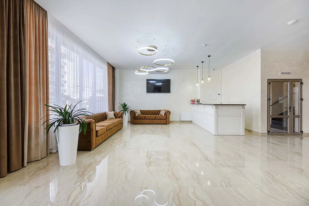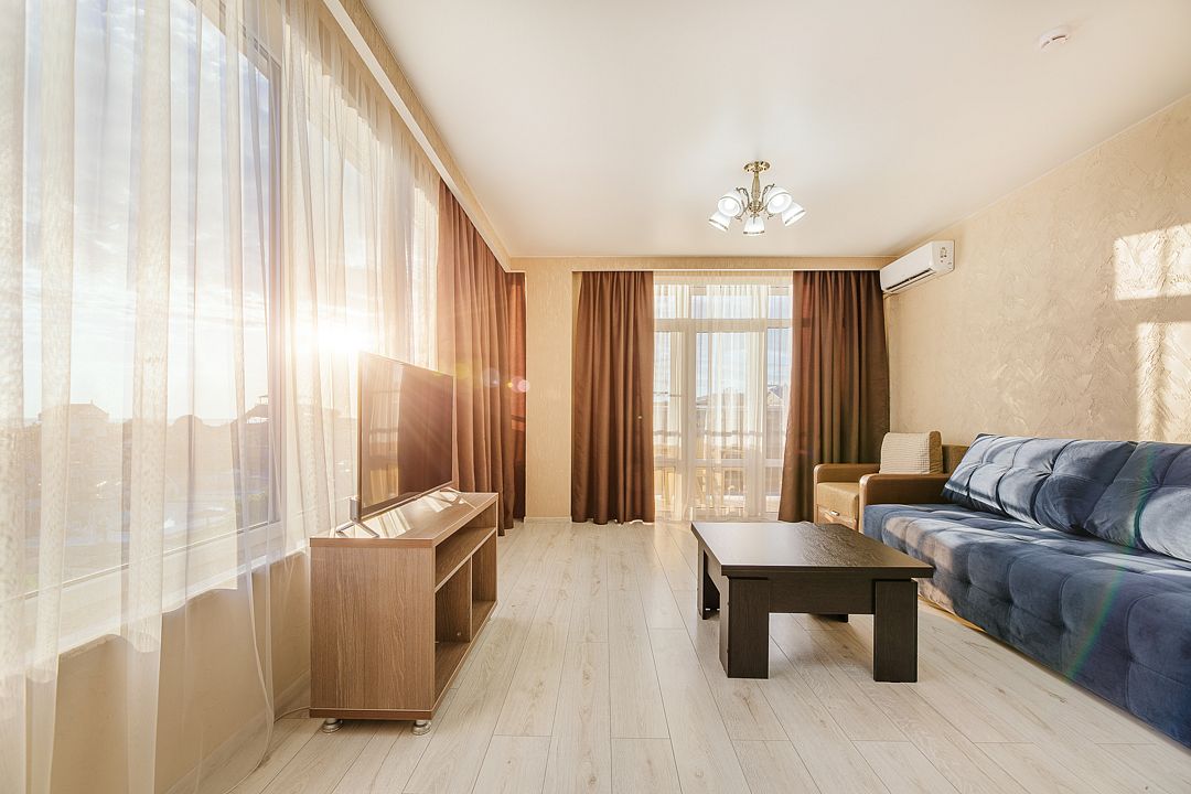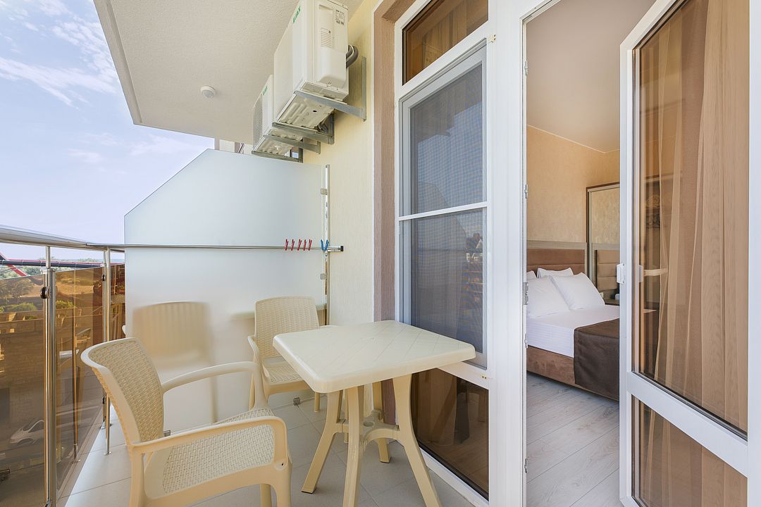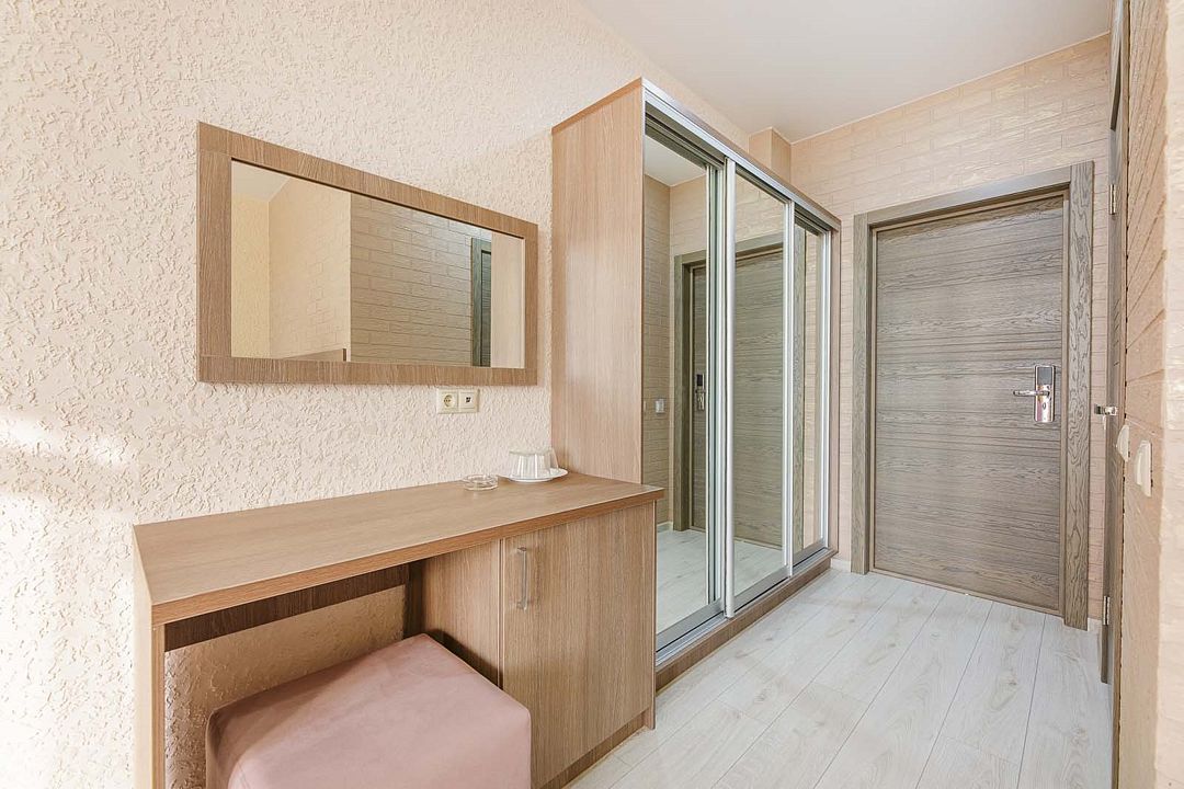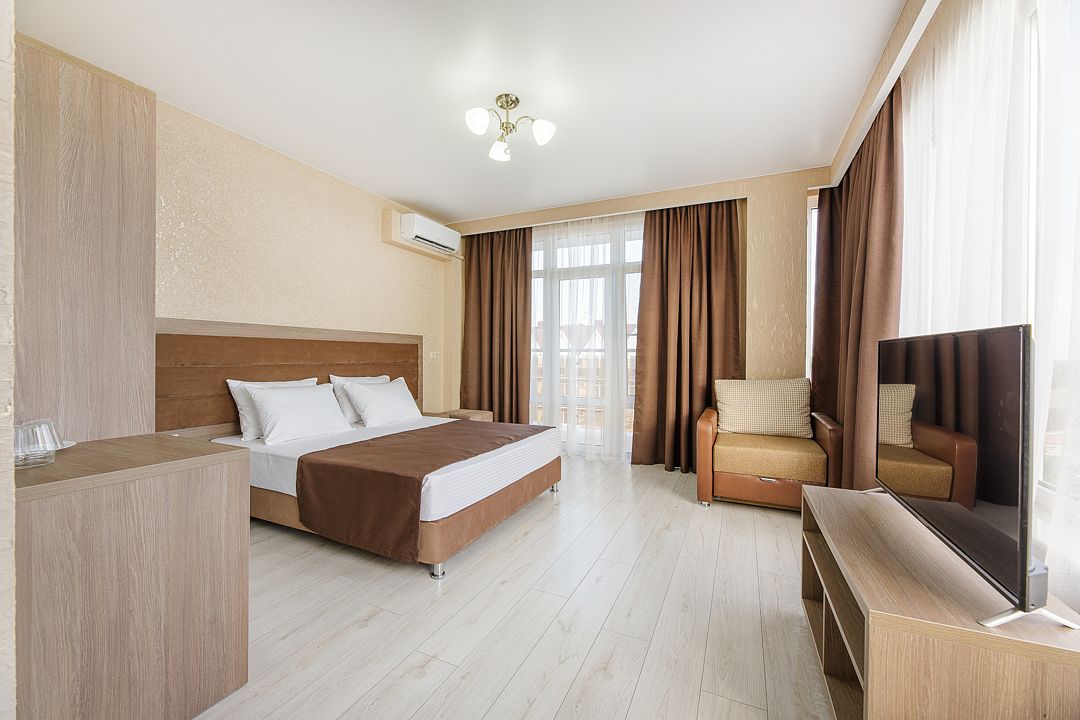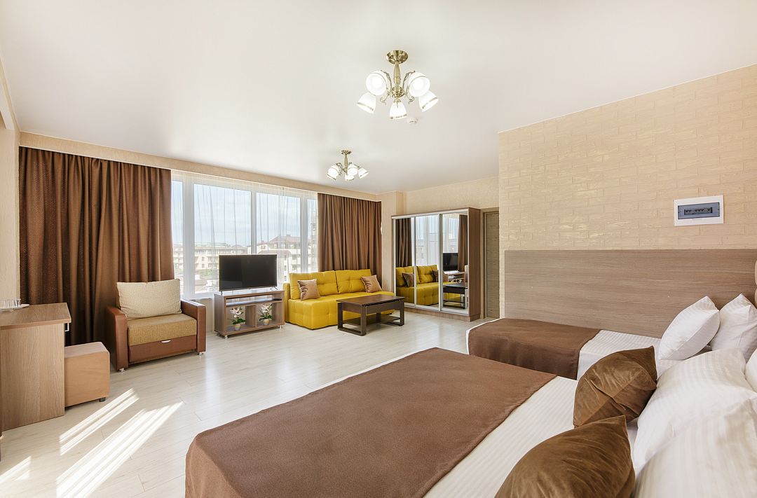 Четырехэтажный корпус отеля располагается всего в 100 метрах от моря. Однокомнатные и двухкомнатные номера с лаконичными интерьерами, выдержанными в пастельной гамме, оснащены необходимыми удобствами.