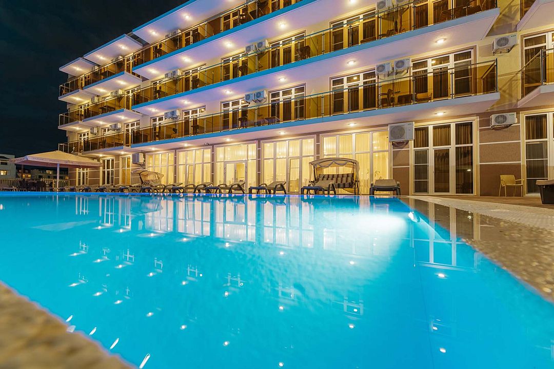 Самолетом до аэропорта г. Анапы, далее на маршрутном такси №113 до остановки «Аквапарк», далее на маршрутном такси №114 до остановки «Бульвар Шардоне», далее 890 м до отеля.