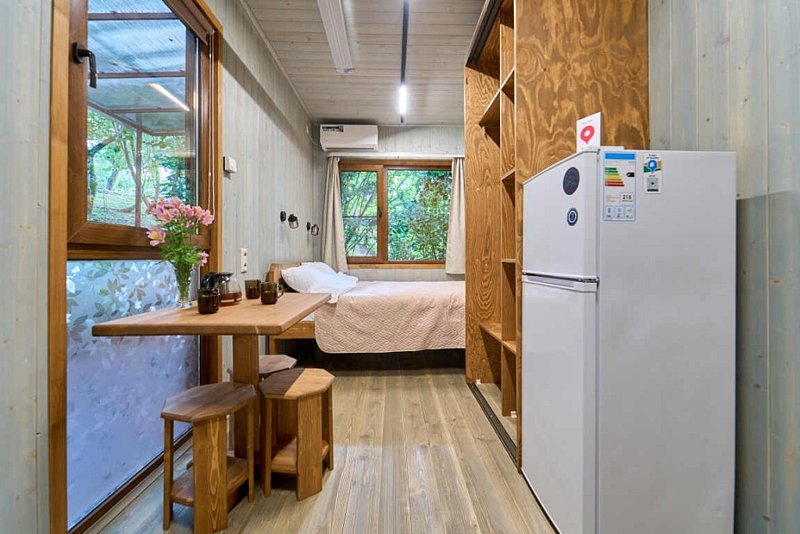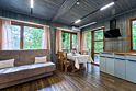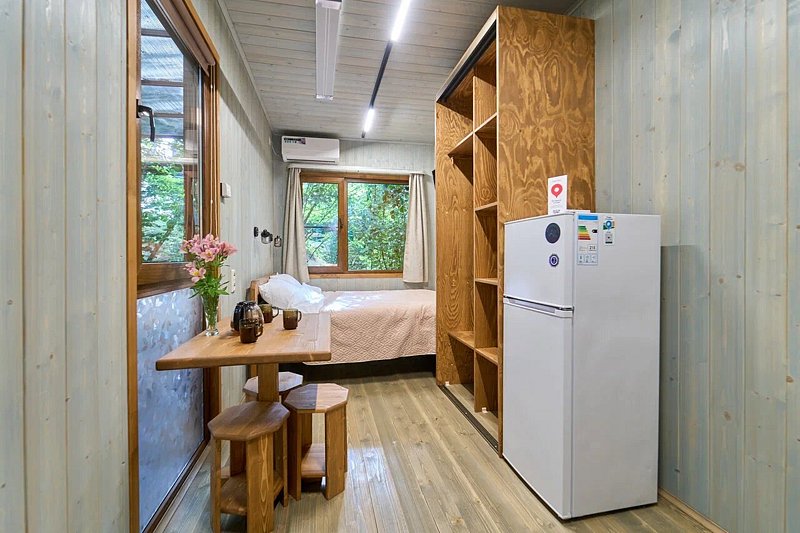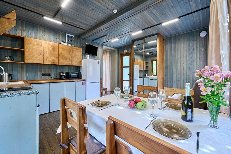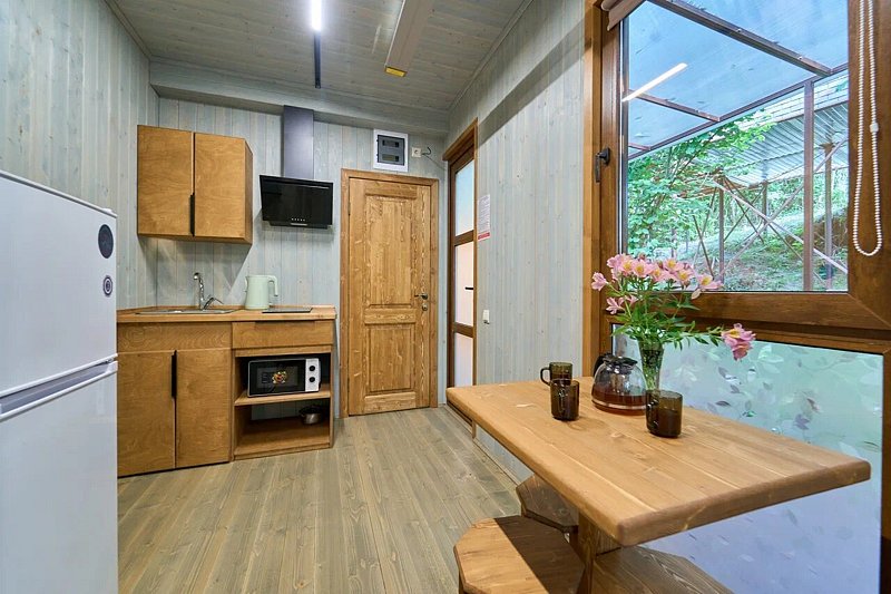 Кухня-гостиная с двуспальным диваном (комплект постельного белья + полотенца) и Smart-TV, оборудованная современной техникой (индукционная плита, СВЧ, кофеварка капельная, чайник и посудой до 4 человек). Пребывание дневное (свыше 4 человек) – 500 ₽, с предоставлением спального места – 1000 ₽ в сутки.