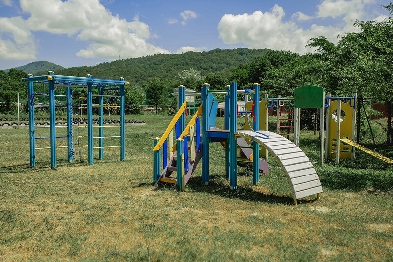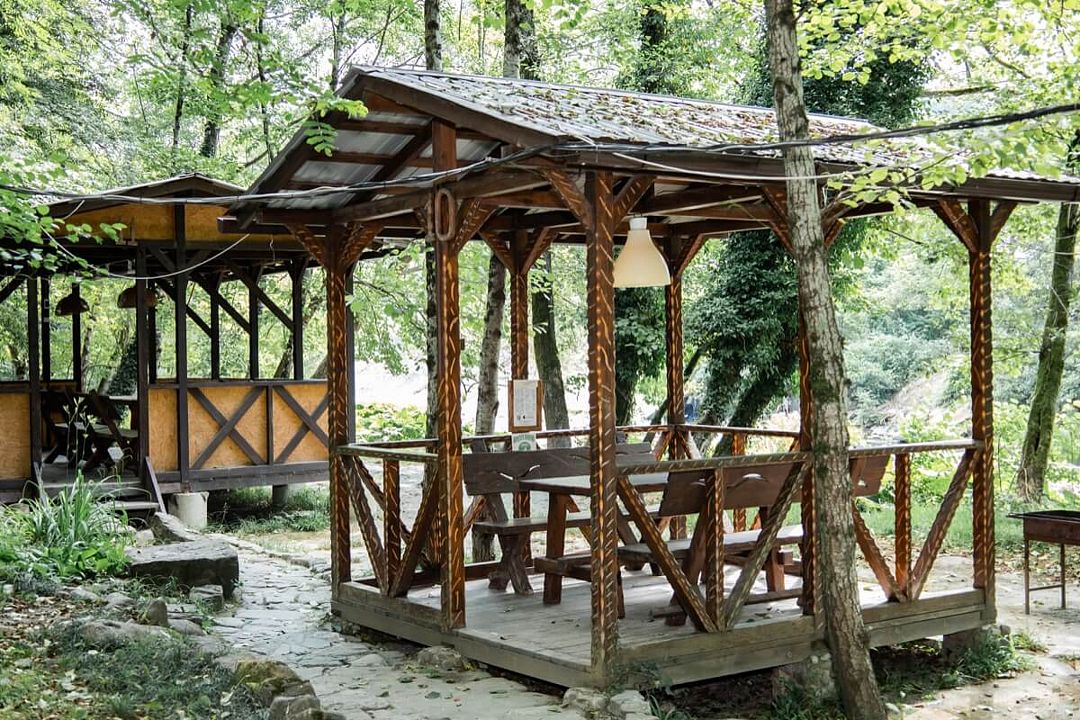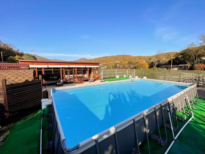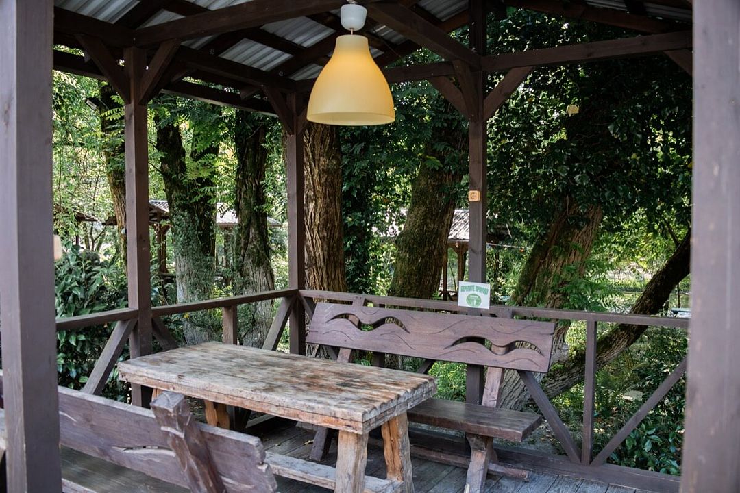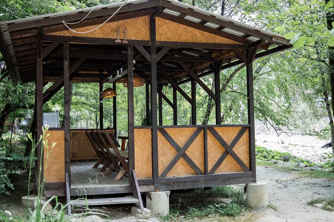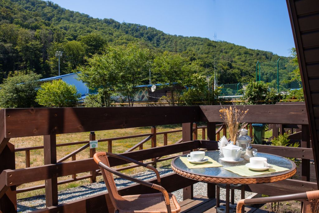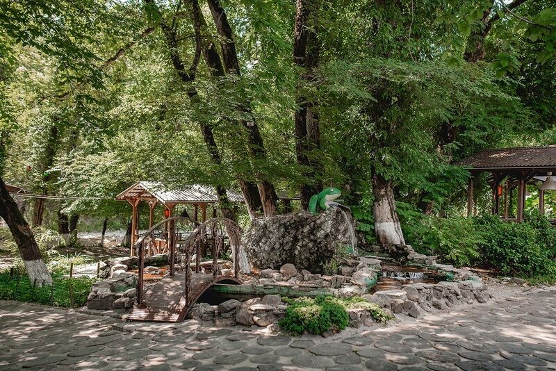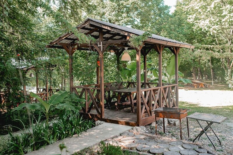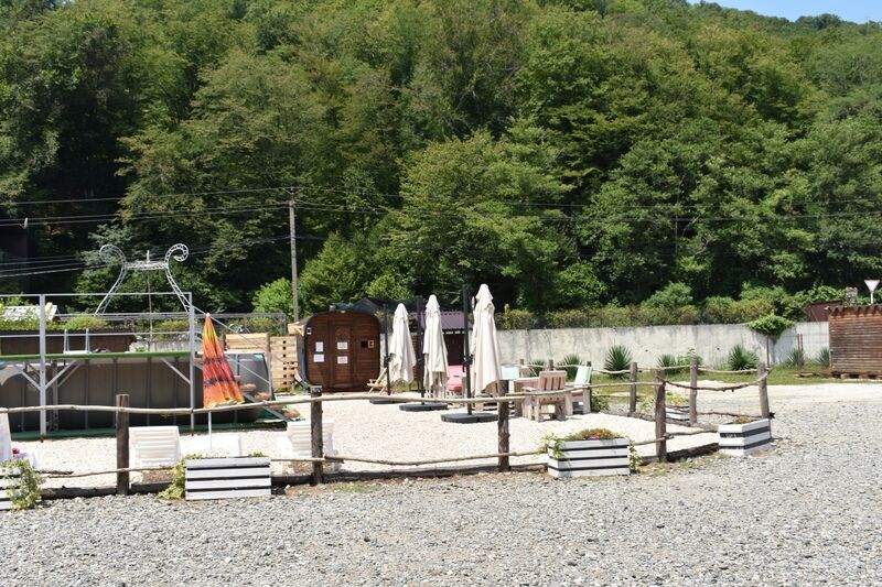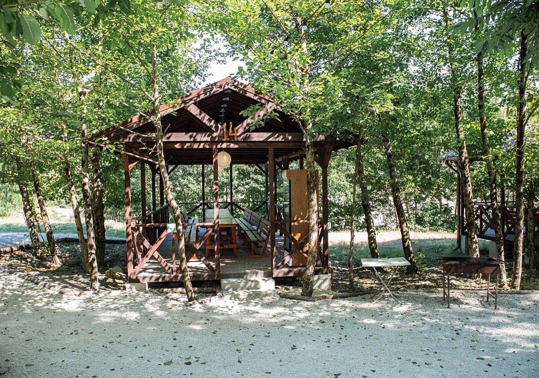База отдыха расположена в предгорьях Кавказа, вдали от загруженных автомагистралей и моря, рядом с небольшой горной речкой.