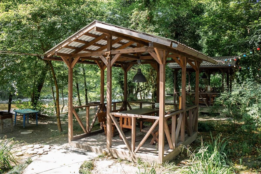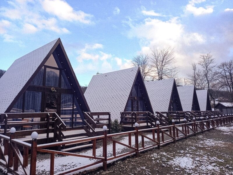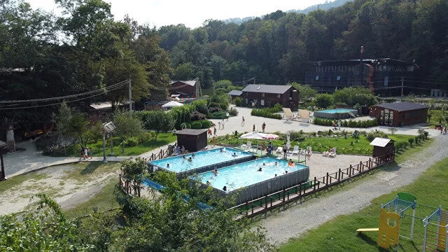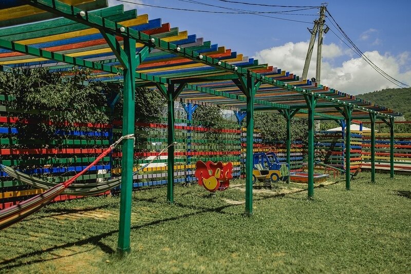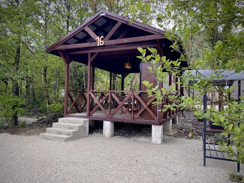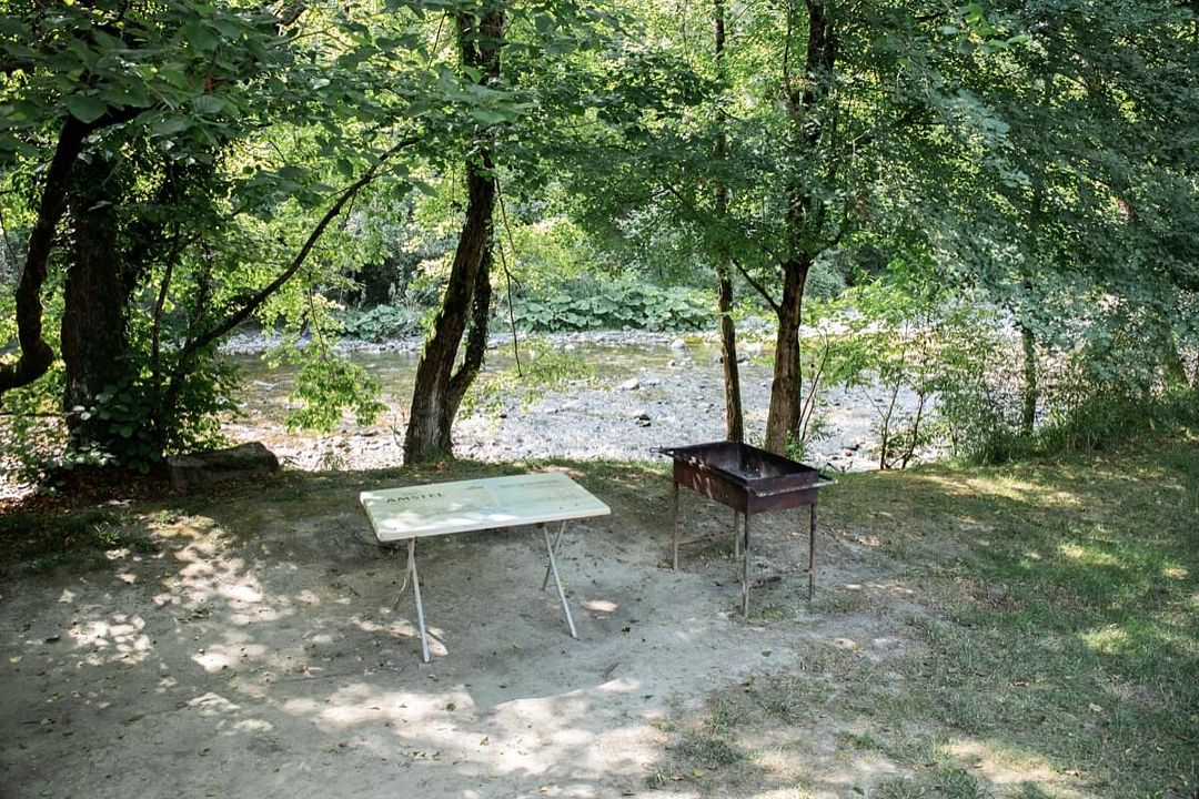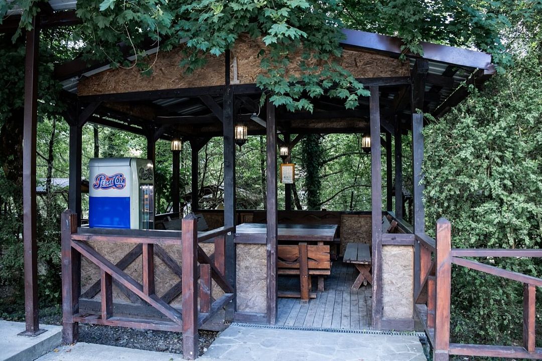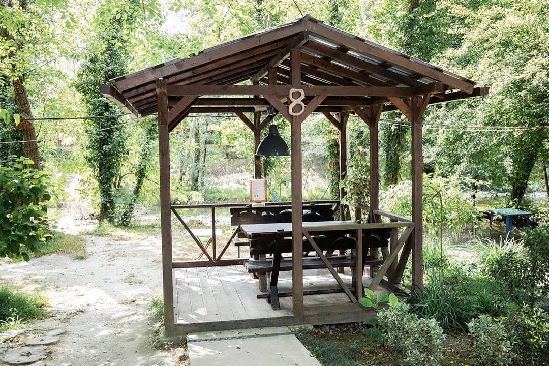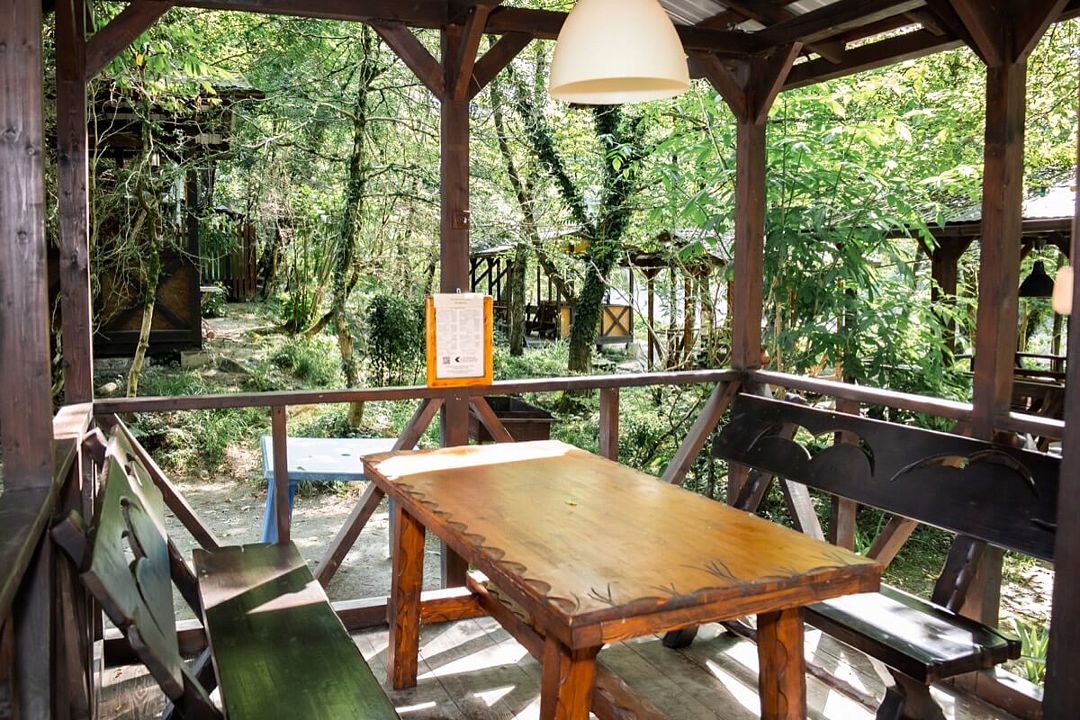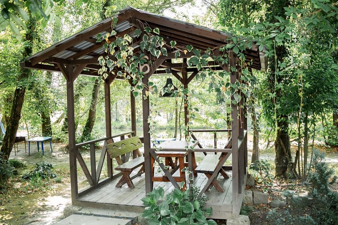 База отдыха расположена в предгорьях Кавказа, вдали от загруженных автомагистралей и моря, рядом с небольшой горной речкой.