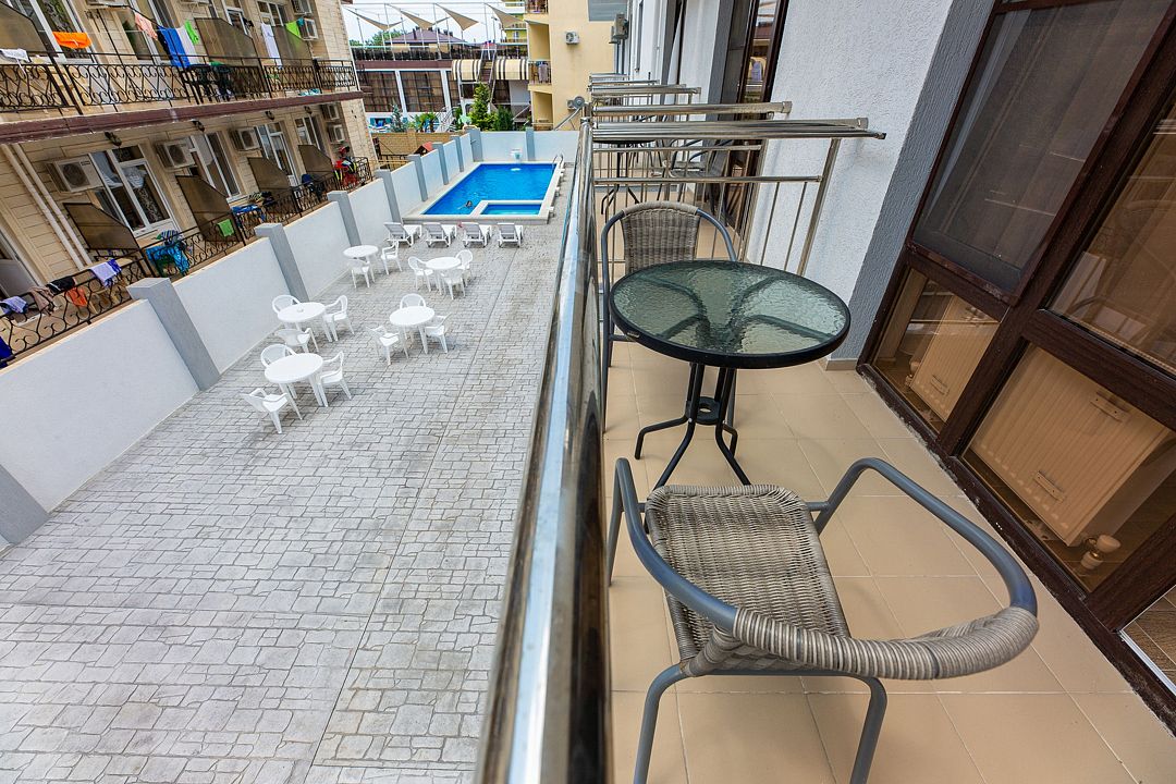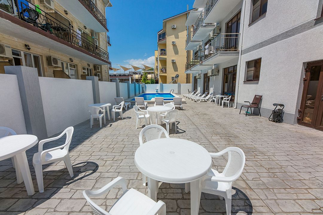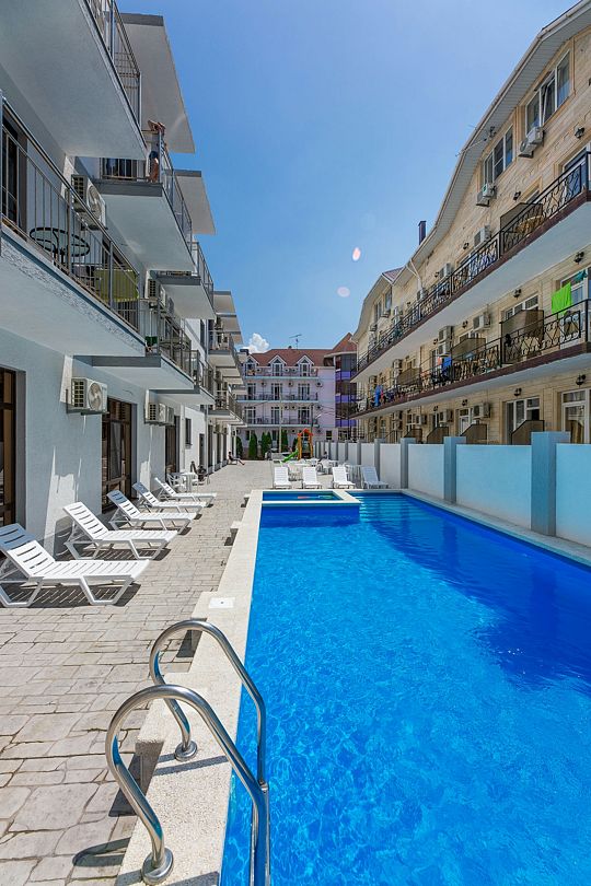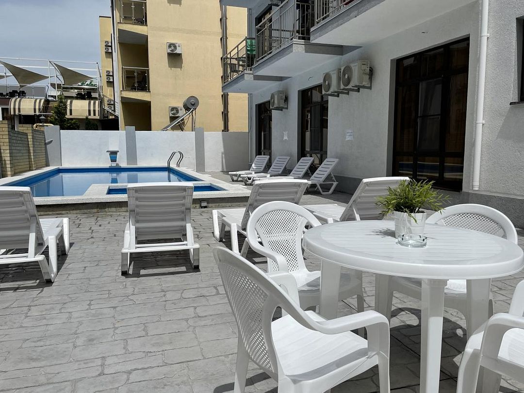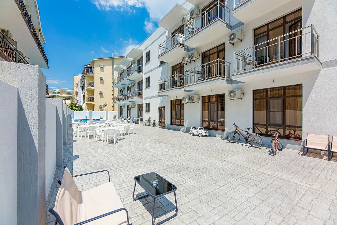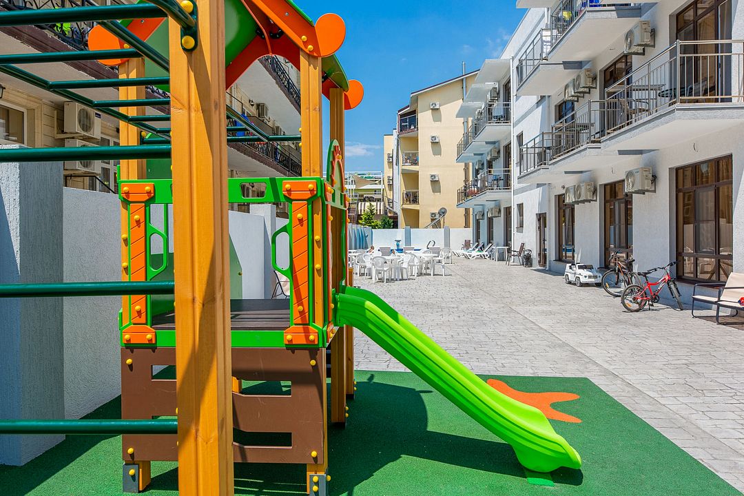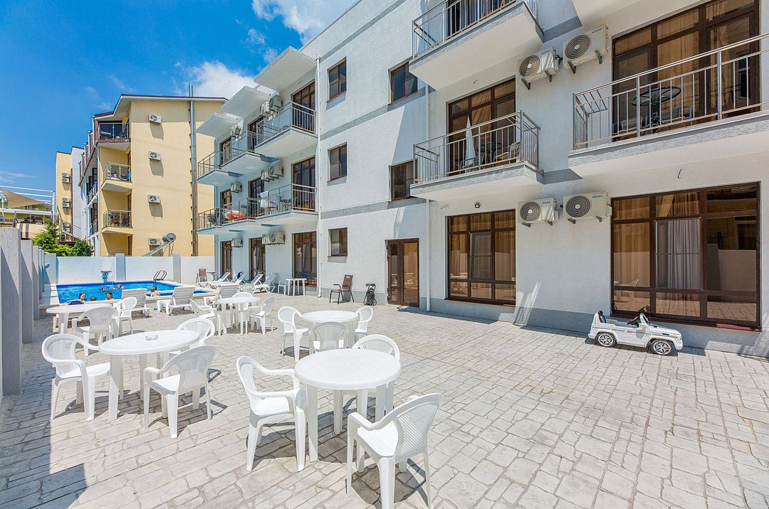 Путешествие с семьейОбязательно вернемся именно в этот отель!Отель очень понравился. Есть все необходимое. Хорошая звукоизоляция, за закрытыми окнами не слышно совсем шума с улицы, да и соседей не слышали. В меру удален от шумной Паралии и недалеко от моря, минут 10 пешком. Каждый день производилась влажная уборка, минимум раз в два дня менялись полотенца. Территория чистая, есть бассейн, детская площадка и бар. Мангальной зоны нет и это онромный плюс! Шашлыки в Витязеве жарят на каждом шагу и через пару дней ты уже не можешь выносить этот дым и запах.