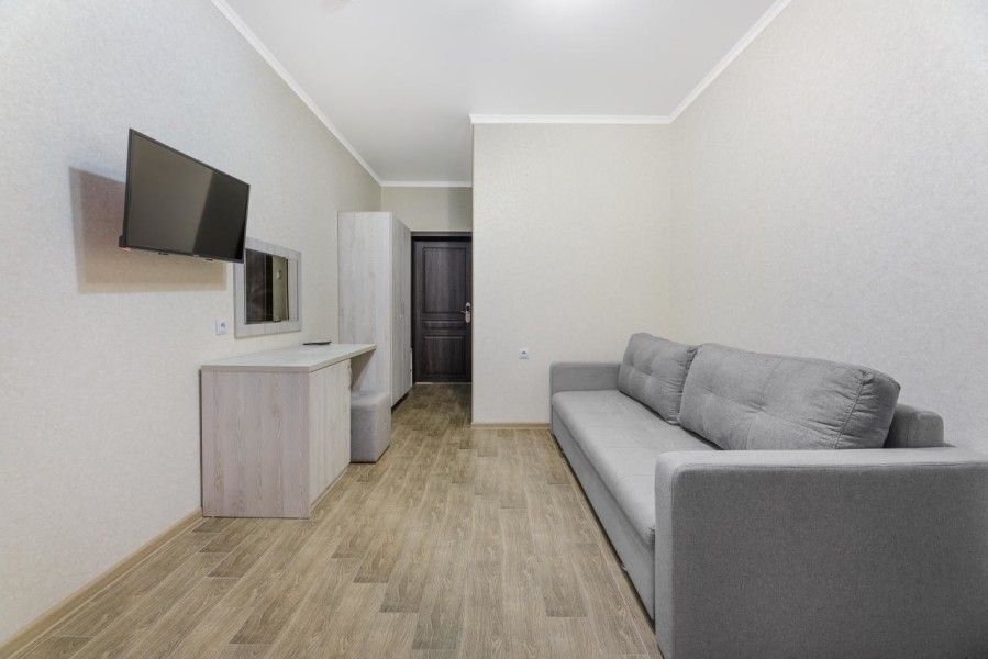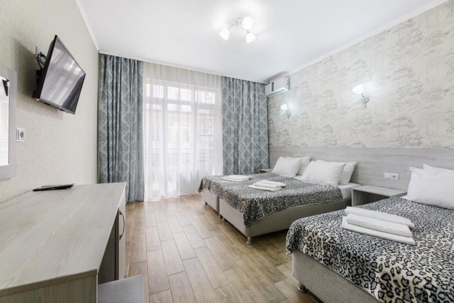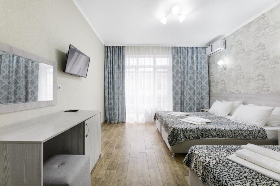 В номере для 4-х персон имеется: двуспальная кровать, раскладной диван, шкаф, вешалка для одежды с обувницей, прикроватные тумбочки, туалетный столик с зеркалом, пуфик. Для вашего удобства комната оборудована сплит-системой, холодильником, ЖК-телевизором, сейфом.