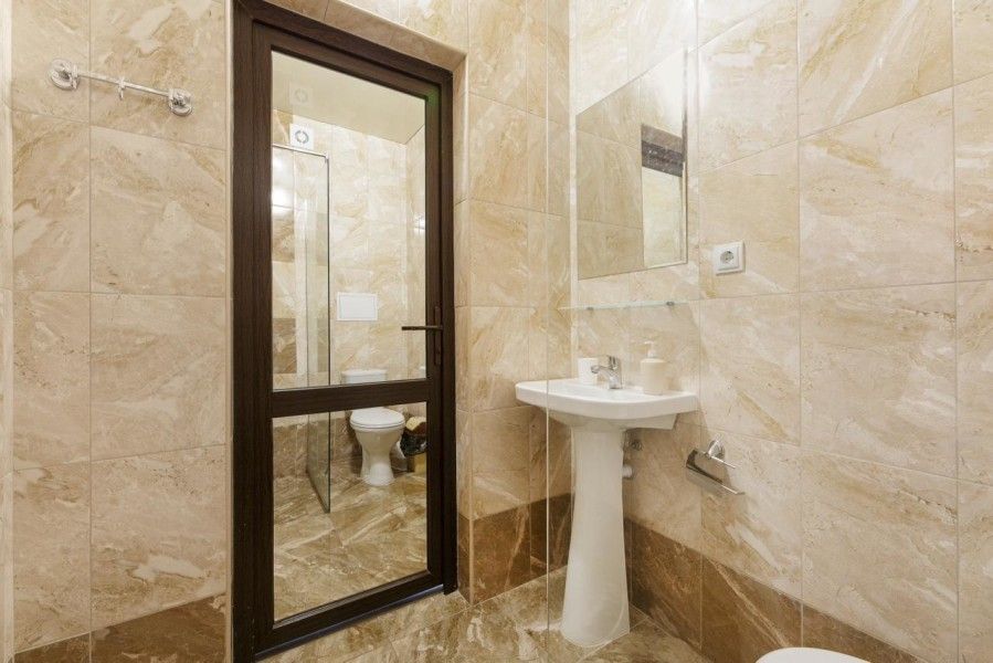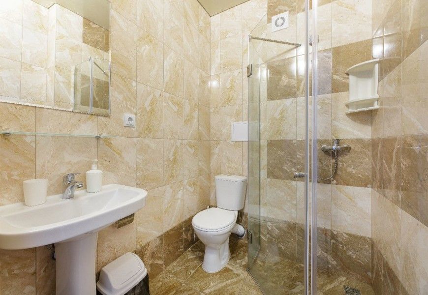 Санузел с душевой кабинкой, туалетом умывальником с зеркалом находится в номере. В этом номере есть возможность установки дополнительного места.