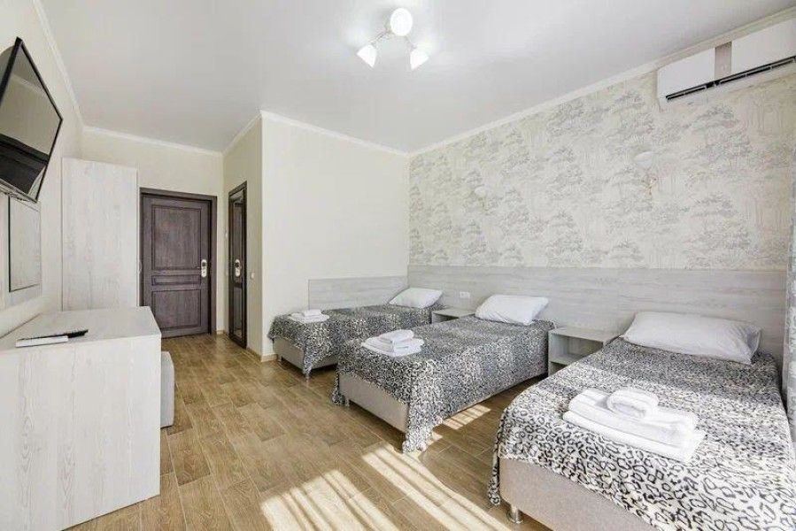 В номере для трех персон имеется: двуспальная кровать, односпальная кровать, или раскладной кресло, шкаф, вешалка для одежды с обувницей, прикроватные тумбочки, туалетный столик с зеркалом, пуфик. Для вашего удобства комната оборудована сплит-системой, холодильником, ЖК-телевизором, сейфом.