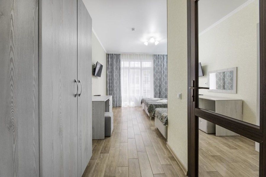 В номере для трех персон имеется: двуспальная кровать, односпальная кровать, или раскладное кресло, шкаф, вешалка для одежды с обувницей, прикроватные тумбочки, туалетный столик с зеркалом, пуфик.
