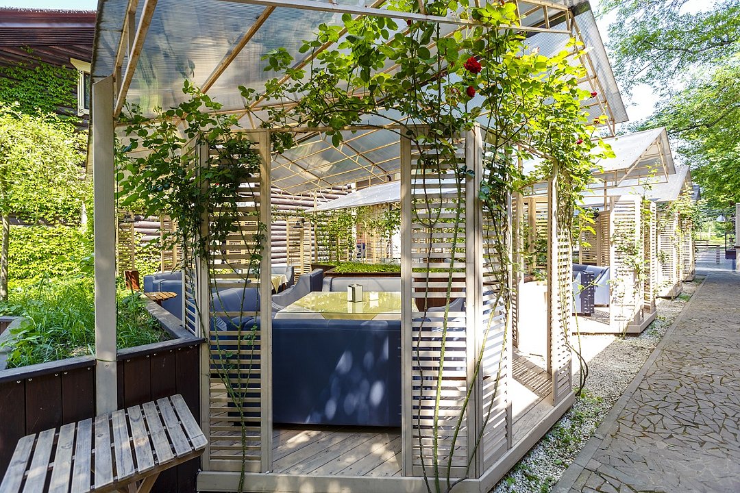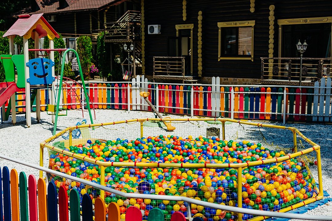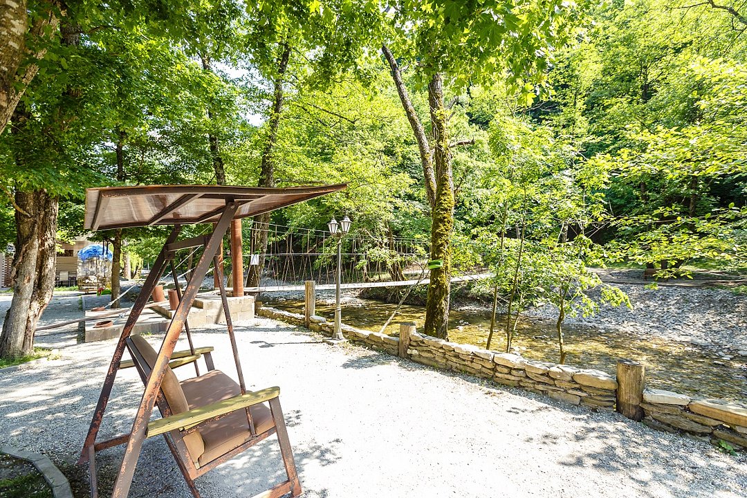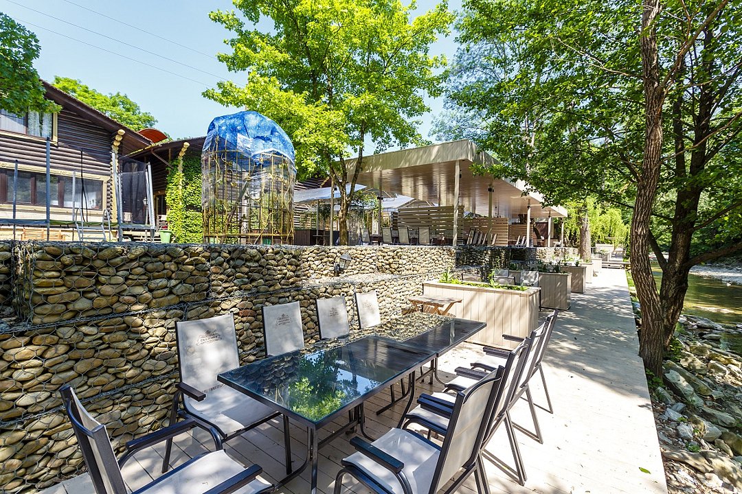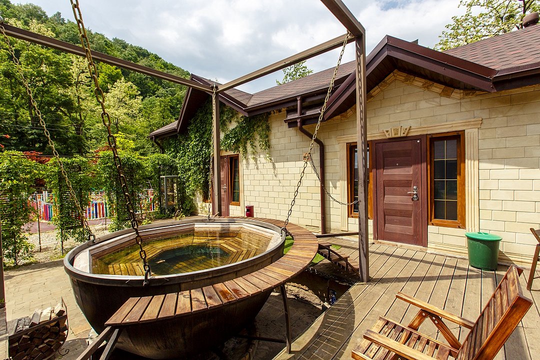 На территории есть открытый бассейн и банный комплекс с восточным хаммамом, классической русской парилкой, чаном «молодости» и отдельной баней возле озера. Также имеются беседки для отдыха в компании, курортный парк с набережной у реки и игровая зона для детей с батутом и мини-гольфом.