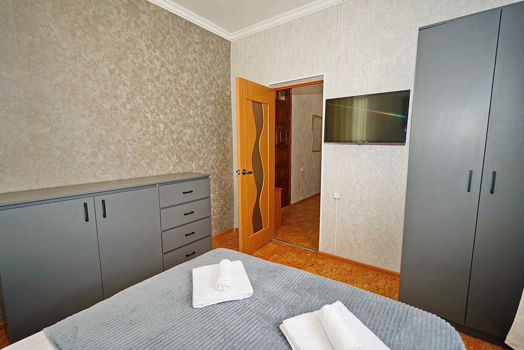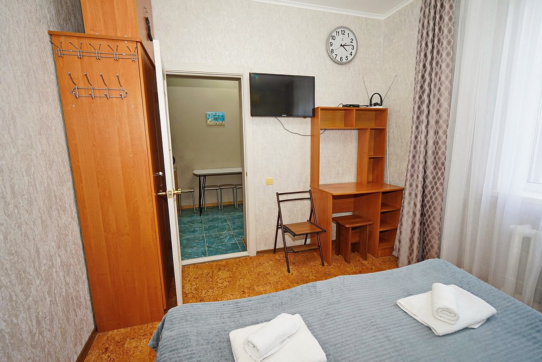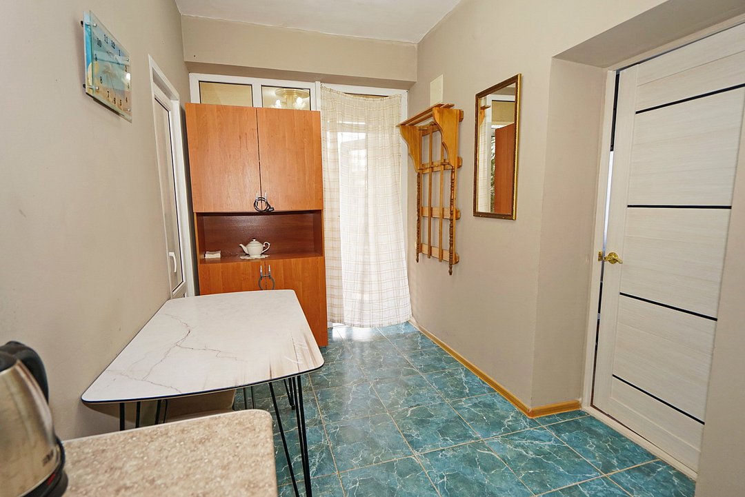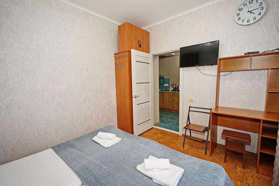 Есть всё необходимое: стол, стулья, шкаф, тумбочки, прихожая с вешалкой и зеркалом. Из техники — телевизор со спутниковым ТВ, холодильник, беспроводной интернет и кондиционер.