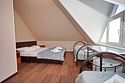 Уютный номер с двуспальной и двумя односпальными кроватями.