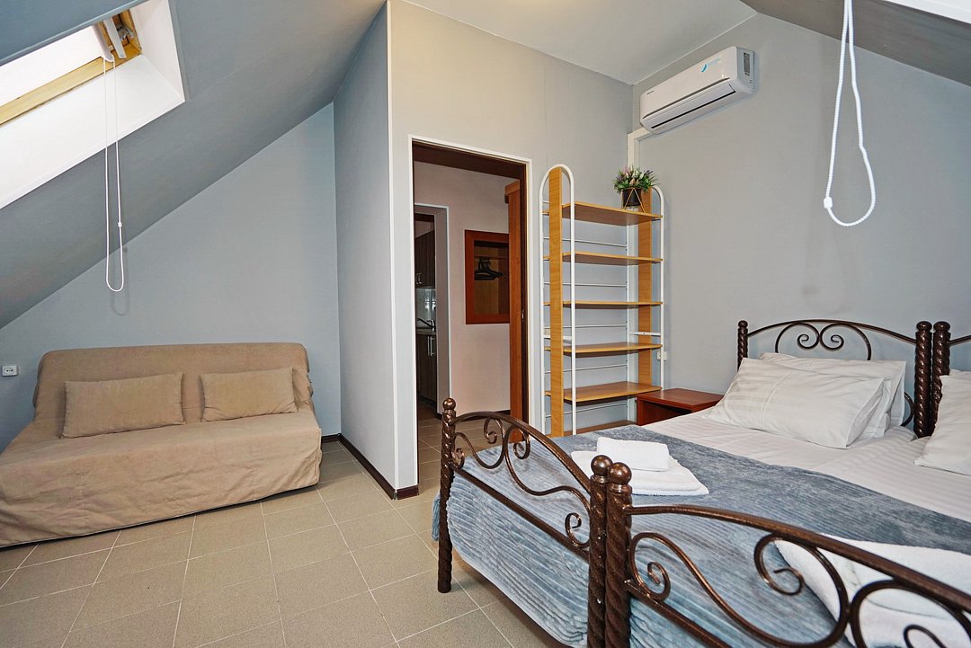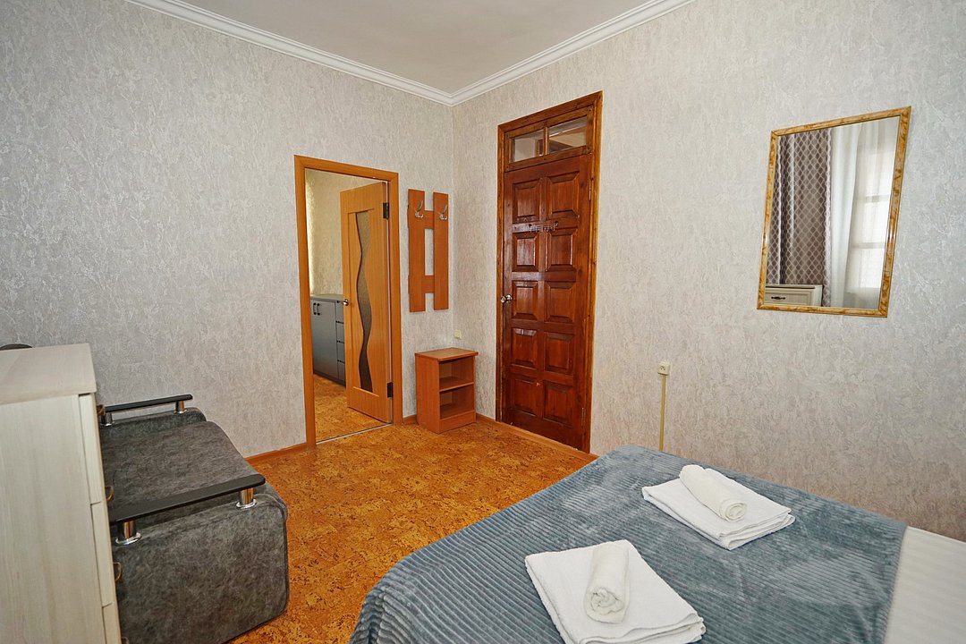 Спальные места: две двуспальные кровати. В номере есть всё необходимое: стол, стулья, шкаф, тумбочки, прихожая с вешалкой и зеркалом. Техника: телевизор со спутниковым ТВ, холодильник, Wi‑Fi, кондиционер. На кухне — гарнитур, плита, полный набор посуды и обеденная зона.