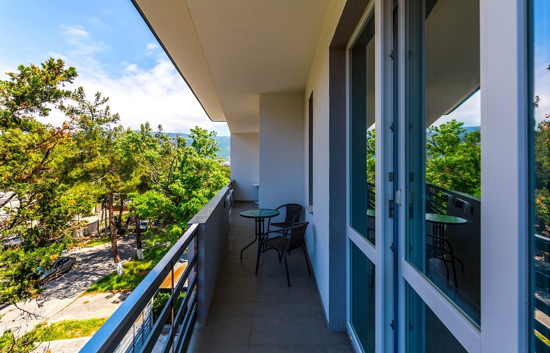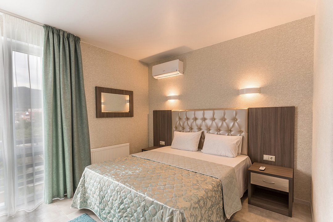 Гостевой дом занимает трехэтажный коттедж с собственным двором. Жилой фонд состоит из нескольких вариантов размещения, от двухместной комнаты до семейного двухкомнатного номера. В каждой категории в наличии большая удобная кровать, а также раскладывающийся диван или кресло. Техническое оснащение включает телевизор, холодильник, фен, кондиционер. Большинство номеров располагает панорамным остеклением, некоторые имеют выход на балкон. Из окон открывается живописный вид на горный хребет.