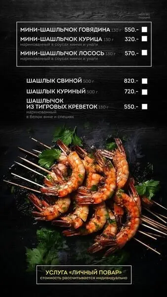 Вы можете сделать заказ по меню и к вашему приезду доставят свежие продукты для самостоятельного приготовления на гриле.