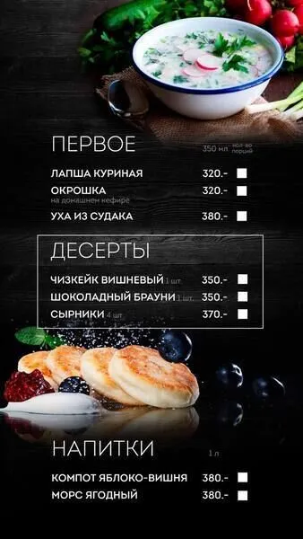 Предоставляются услуги профессионального повара, который будет готовить в вашем присутствии. Либо вы можете заказать заранее готовые блюда, напитки из меню к обеду или завтраку.