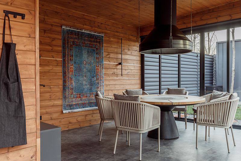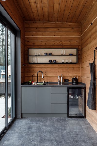 - Мангальное помещение: дровяной очаг-гриль, холодильник, настенные тепловентиляторы, умная музыкальная колонка, Яндекс-станция.