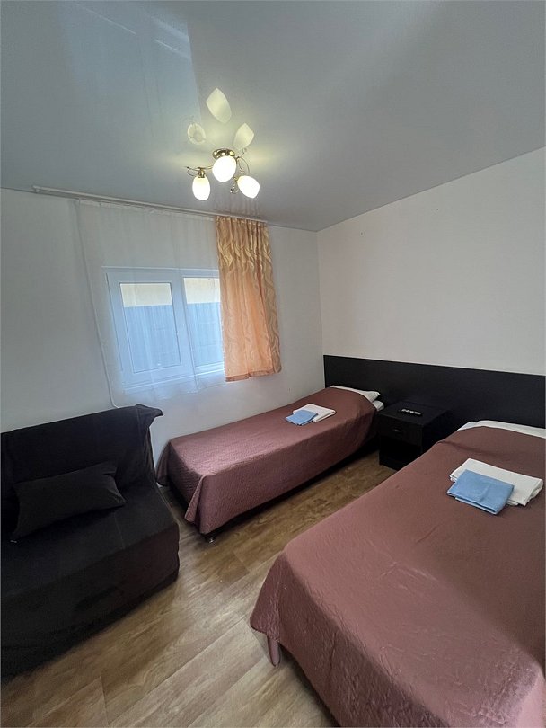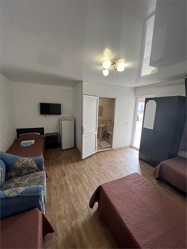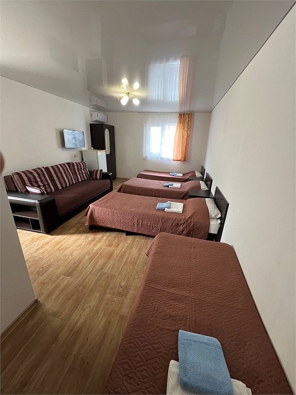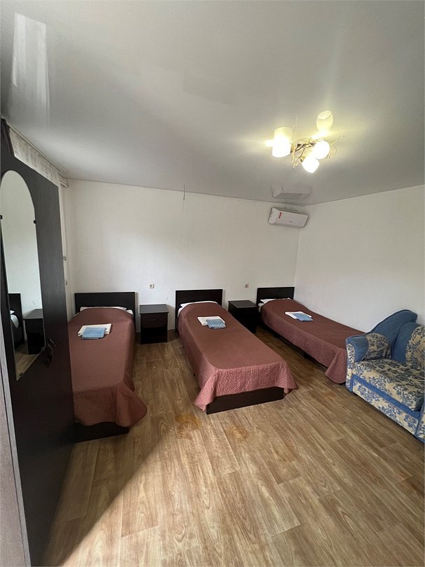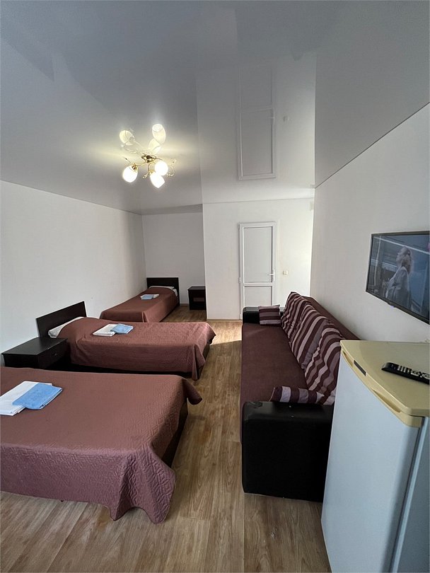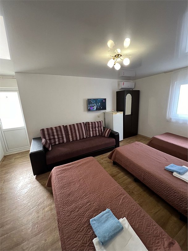Семейный номер с одной двухспальной, двумя односпальными кроватями и диваном. Оснащение номера: душ, туалет, телевизор 20 каналов , кондиционер и холодильник.Услуги и удобства
