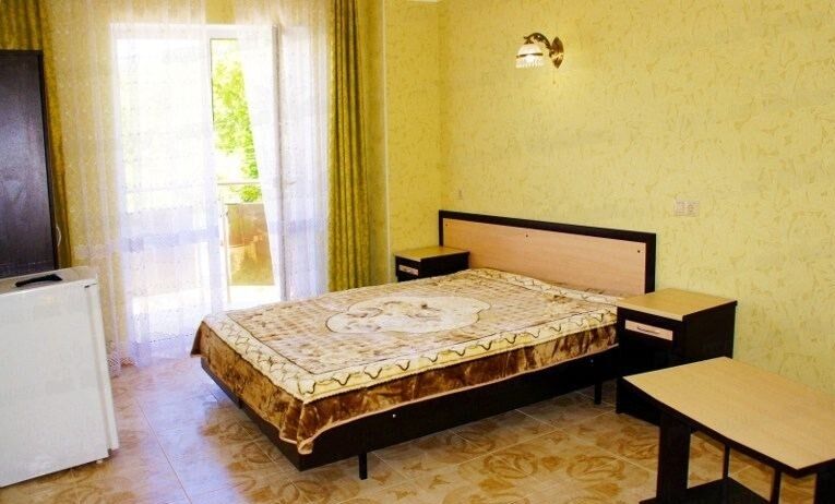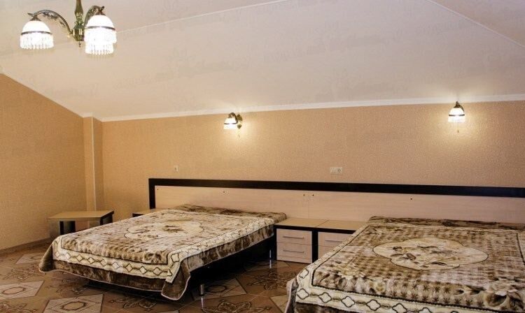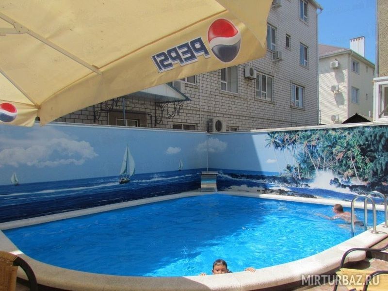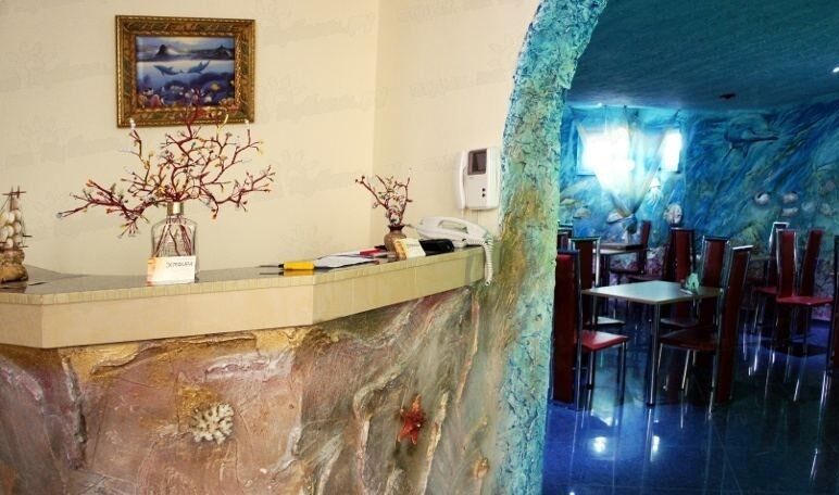 Для размещения гостевой дом предлагает красивые номера на двоих или троих. Также можно снять себе двухкомнатный номер, если у вас большая компания. Каждый номер поразит вас атмосферой уюта и покоя. На первом этаже есть кафе, в котором вы сможете питаться. Столовая в кафе очень красивая и необычная, поскольку выполнена в морском стиле, что создает впечатления обитание под водой. В распоряжении гостей также будет бассейн во дворе, возле которого есть зона отдыха с шезлонгами, столиками и стульями.