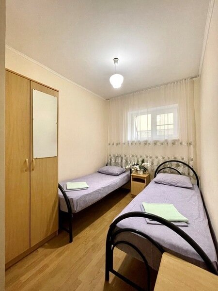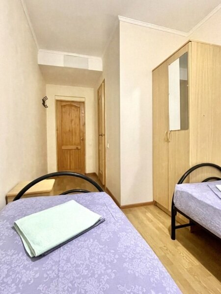 В номере две односпальные кровати, шкаф для одежды, прикроватные тумбы.