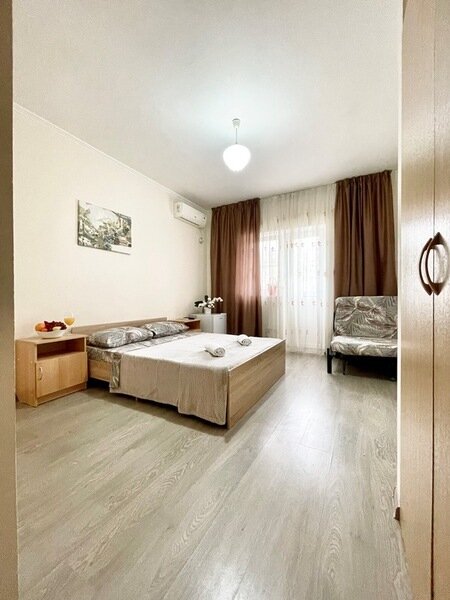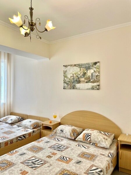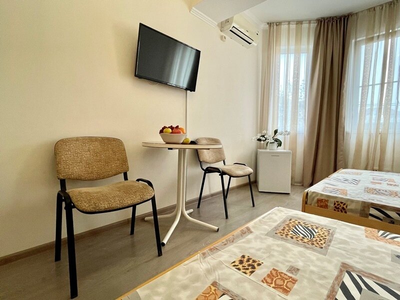 В номере двуспальная кровать, две односпальных кровати, шкаф для одежды, прикроватные тумбы, ТВ, холодильник, фен, кондиционер.