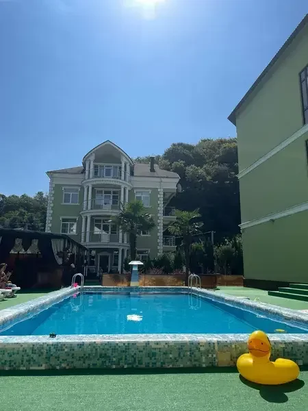 Начну с плюсов: Номера большие и чистые(в силу того что отель новый), большая территория,хорошая детская площадка,шикарный бассейн с вечерней подсветкой(всегда чистый) спасает когда плохая погода и лень идти на море!,всегда есть горячая вода,кондиционер,все для шашлыка,до моря отвозят,большая кухонная зона.