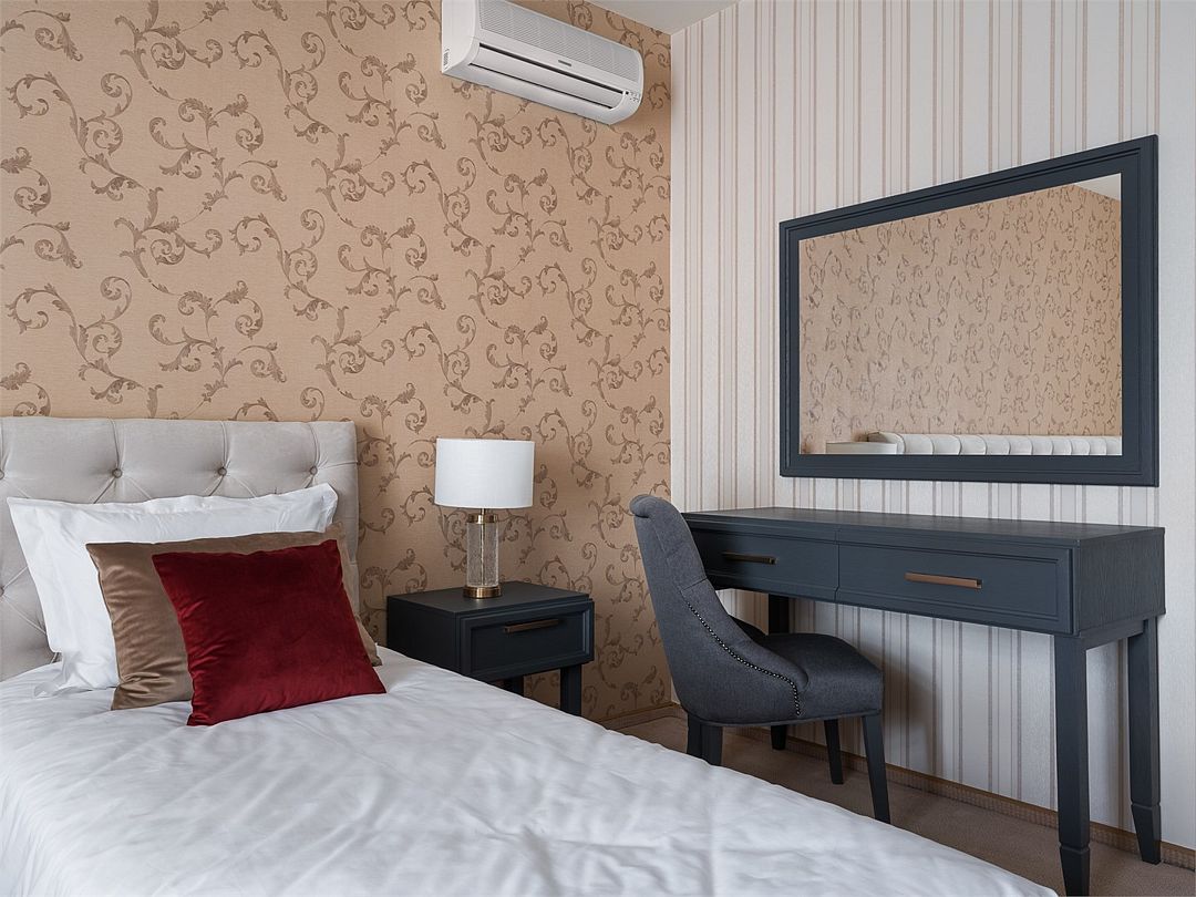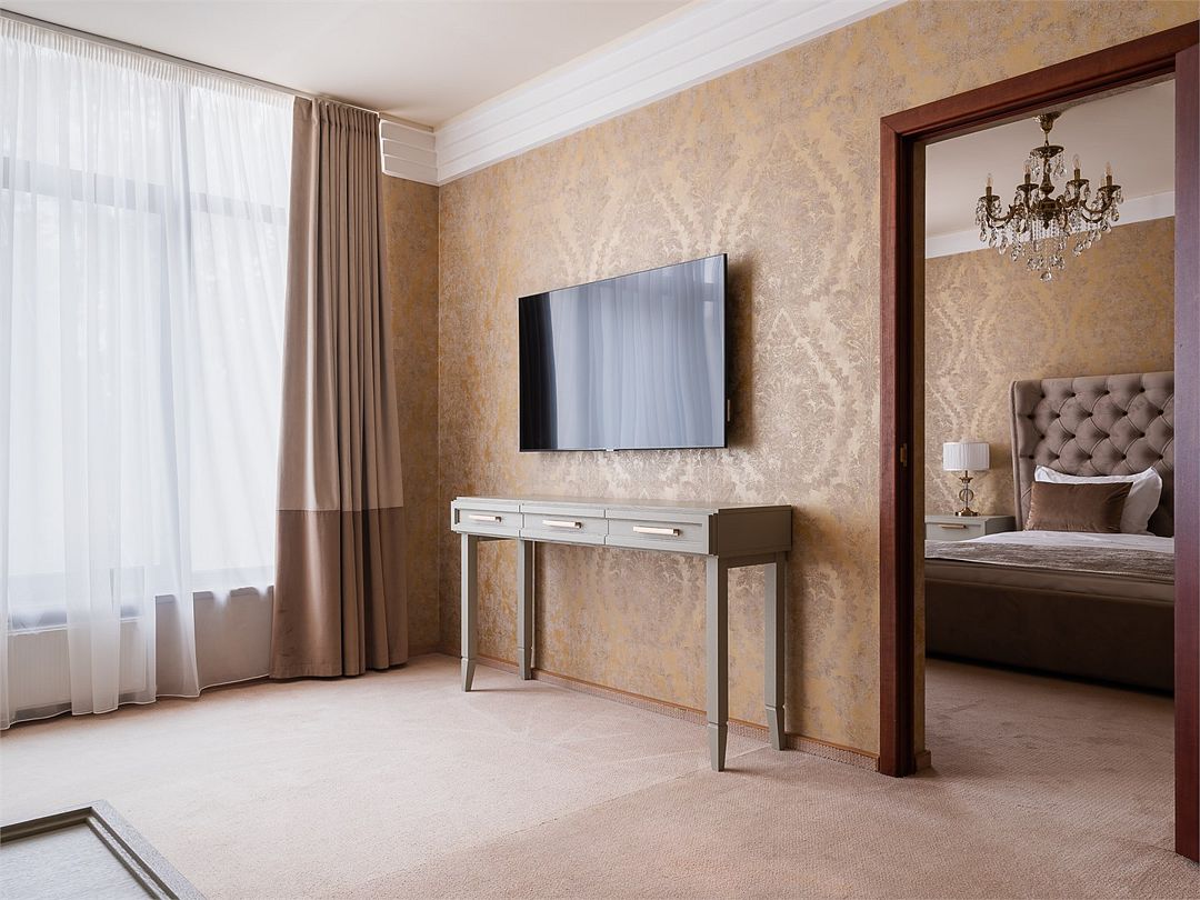 два телевизора, Wi-Fi, кондиционер, гидромассажная ванна, халаты, тапочки, балкон, односпальная кровать, ортопедический матрас, шкаф для одежды, вешалки, журнальный столик, туалетный столик, диван-кровать, раскладной диван, мини-холодильникВ гостиничном номере