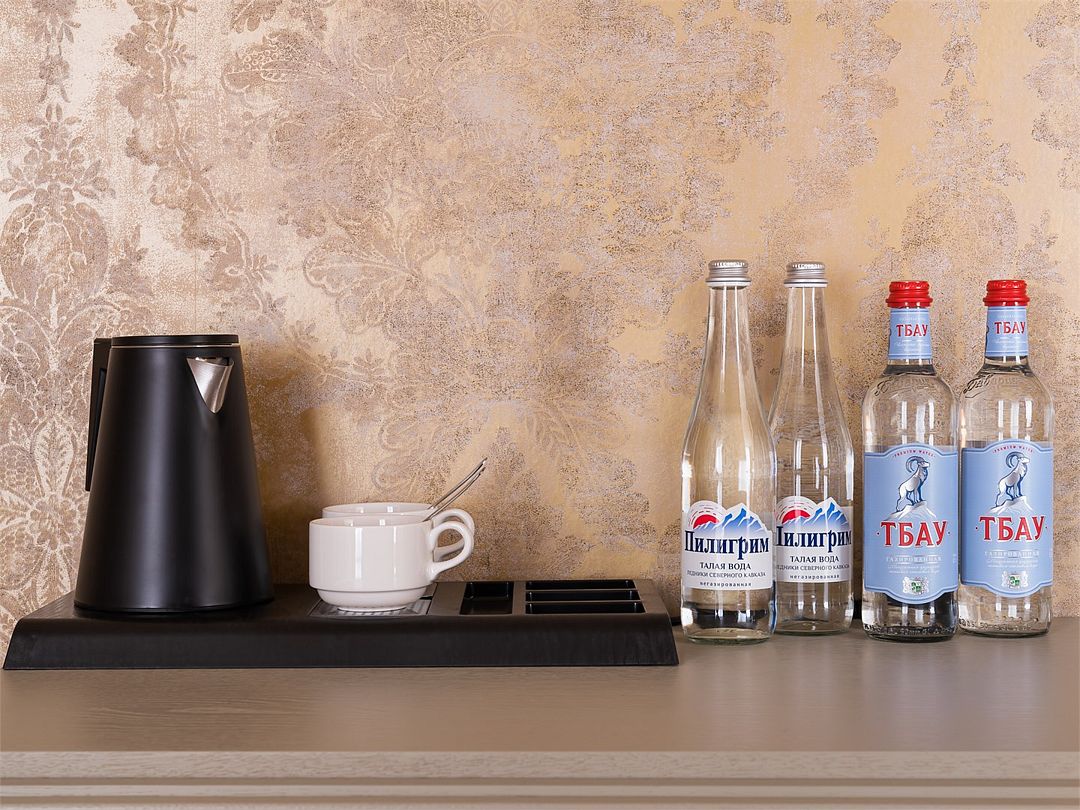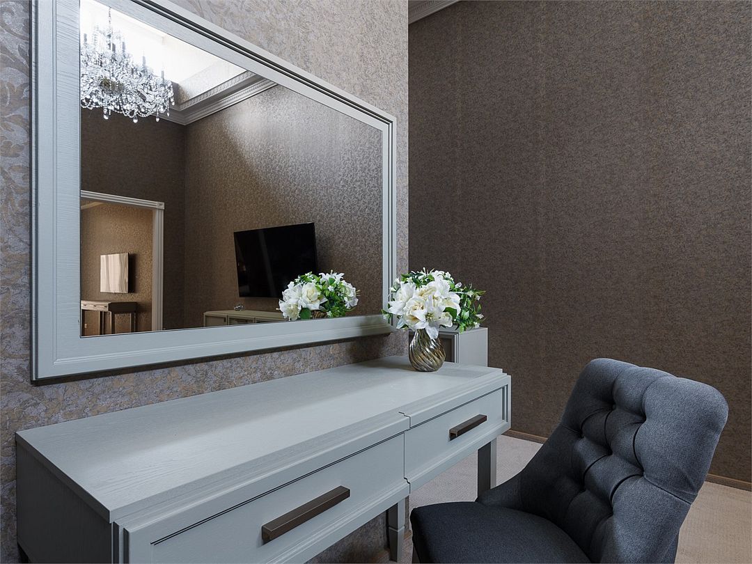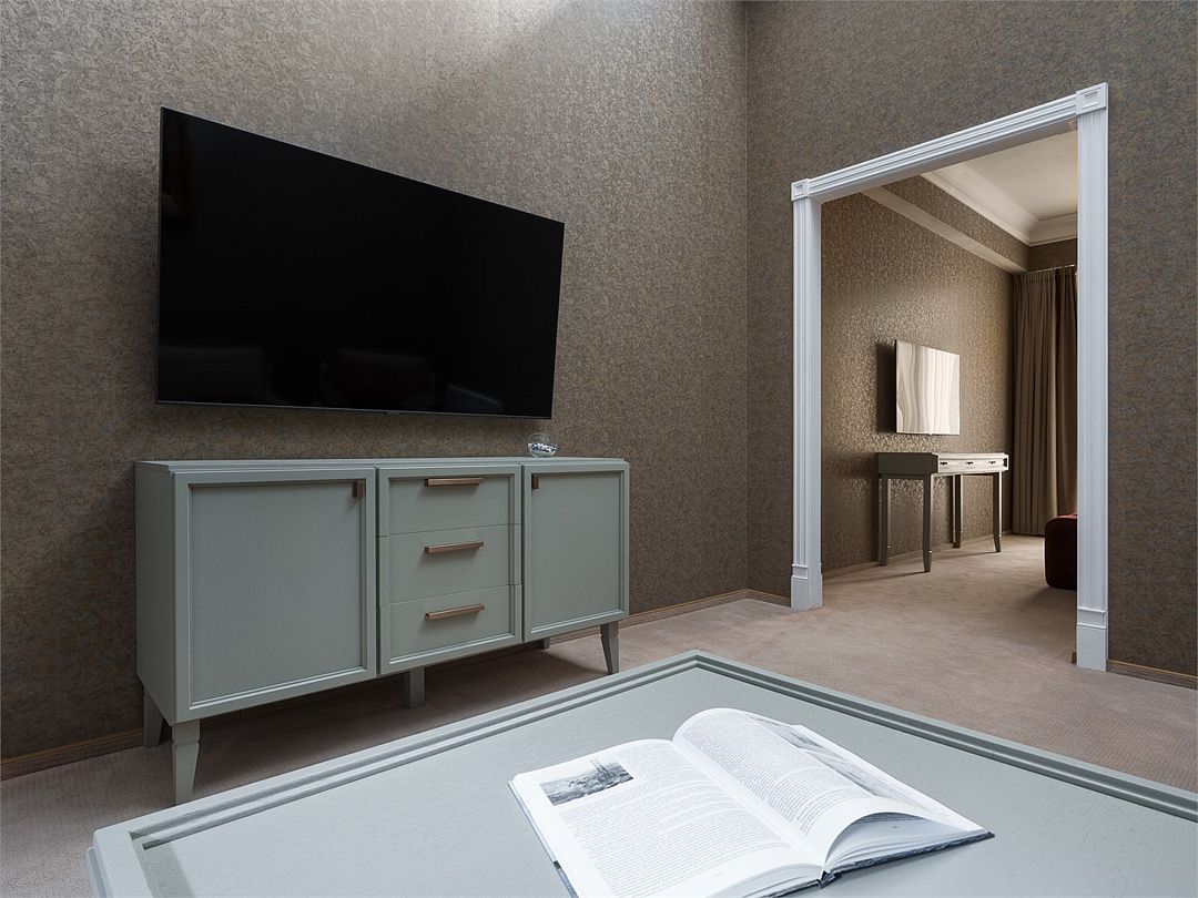 два телевизора, кондиционер, фен, ванна, банные принадлежности, косметические средства, кровать «King size», зеркало, чайный набор, ковровое покрытие, кресло, туалетный столик, диван-кровать, чайная станцияВ гостиничном номере