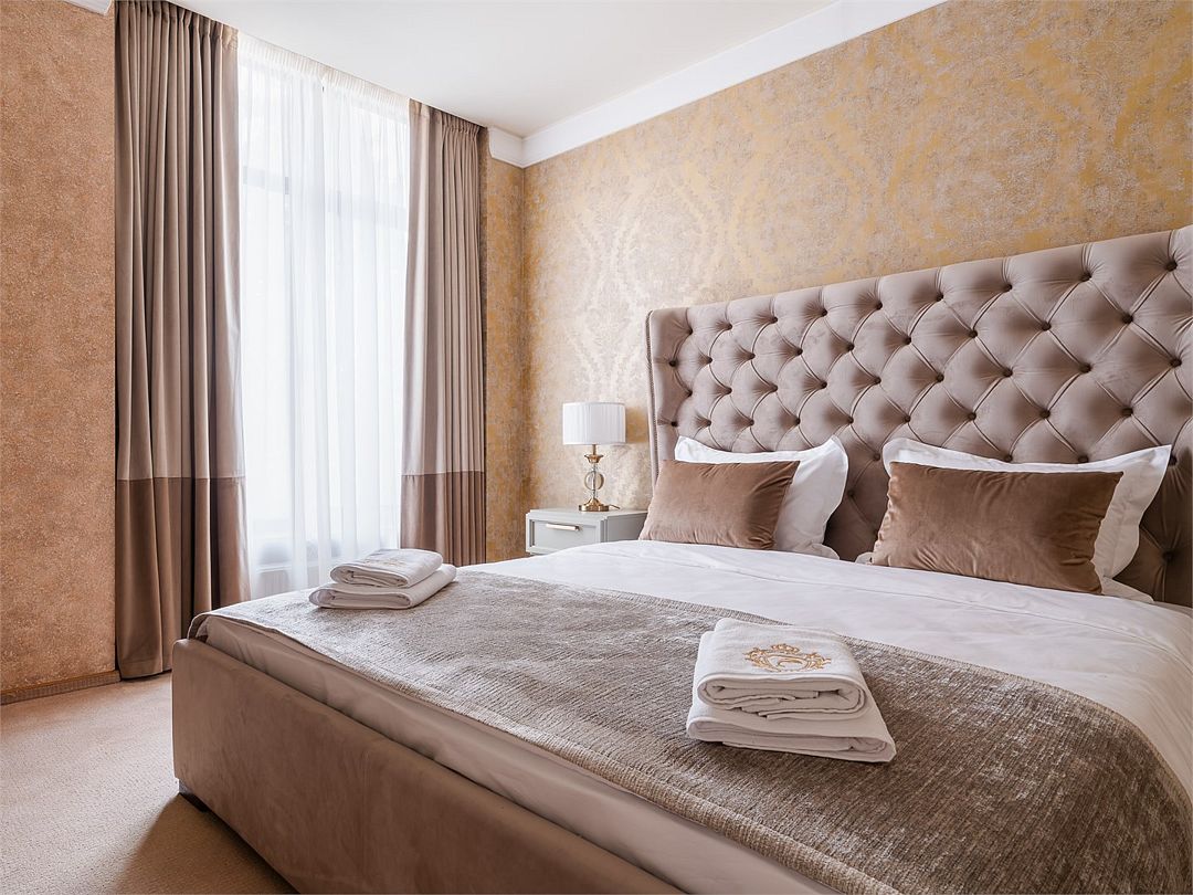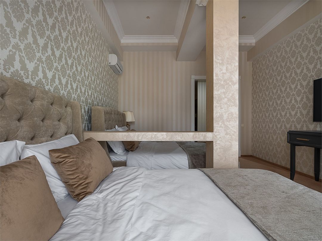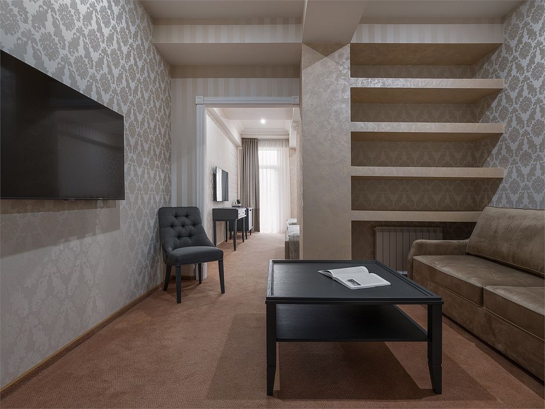 Пространство этого четырехместного номера разделено на две изолированных зоны – спальню и гостиную с межкомнатной дверью. Здесь с комфортом сможет расположиться большая семья с детьми или компания друзей. По запросу возможно размещение на дополнительных местах, что увеличивает вместимость этого номера до шести человек.Услуги и удобства