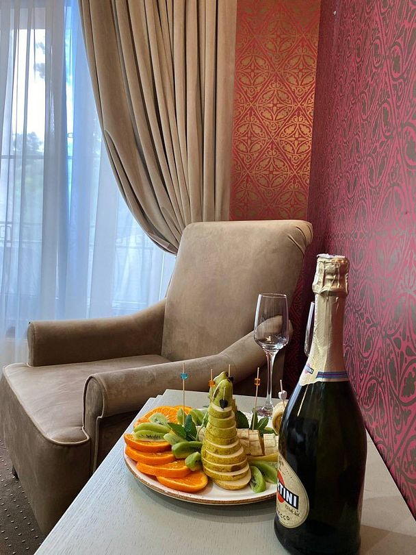 В этом роскошном номере категории люкс впечатляет не только огромный метраж, но и наличие джакузи. Принять ванну с пузырьками после отдыха на море – ни с чем не сравнимое удовольствие! Номер состоит из гостиной и спальни, между которыми не предусмотрена межкомнатная дверь.Услуги и удобства