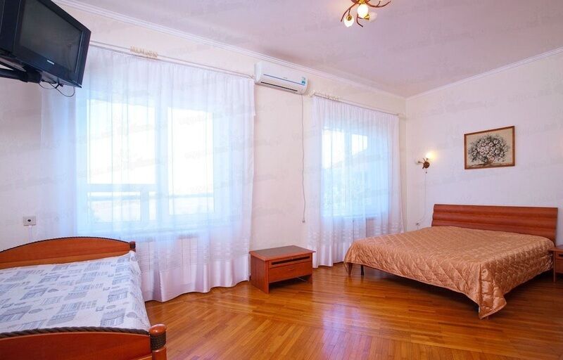 Здание гостевого дома красивое снаружи и очень уютное внутри. Вы сможете выбрать наиболее подходящий номер с удобствами внутри или же на этаже. Каждый номер имеет все для комфортного отдыха после дня на пляже. Также в вашем распоряжении будет современная кухня со всем необходимым для приготовления пищи, а для любителей шашлыка во дворе оборудована мангальная зона. Кроме того, на территории есть сауна и бильярдная комната, которыми вы можете воспользоваться за небольшую доплату.