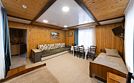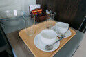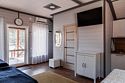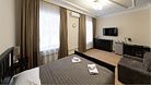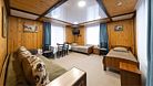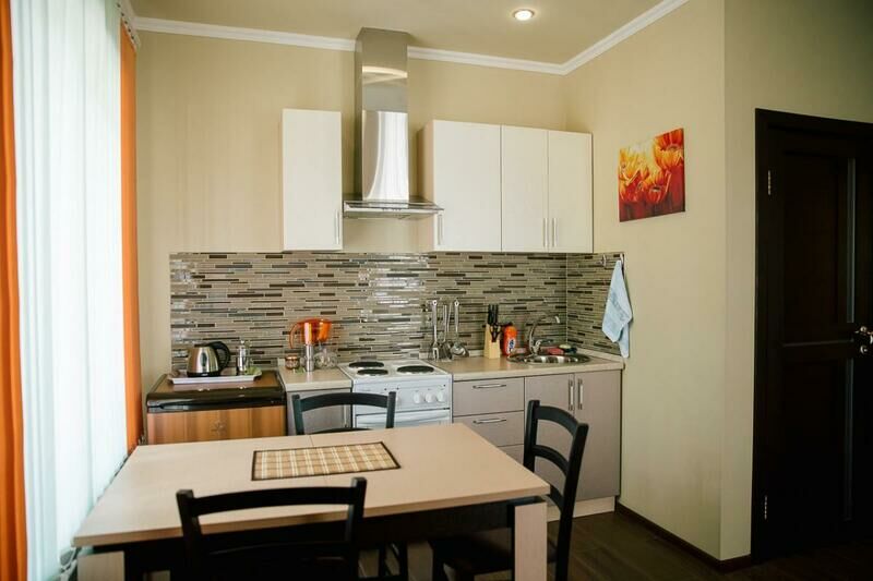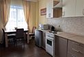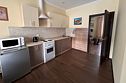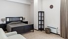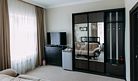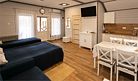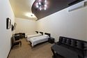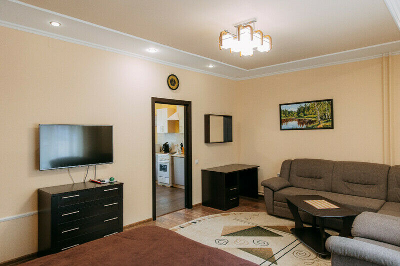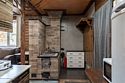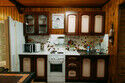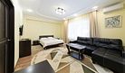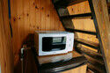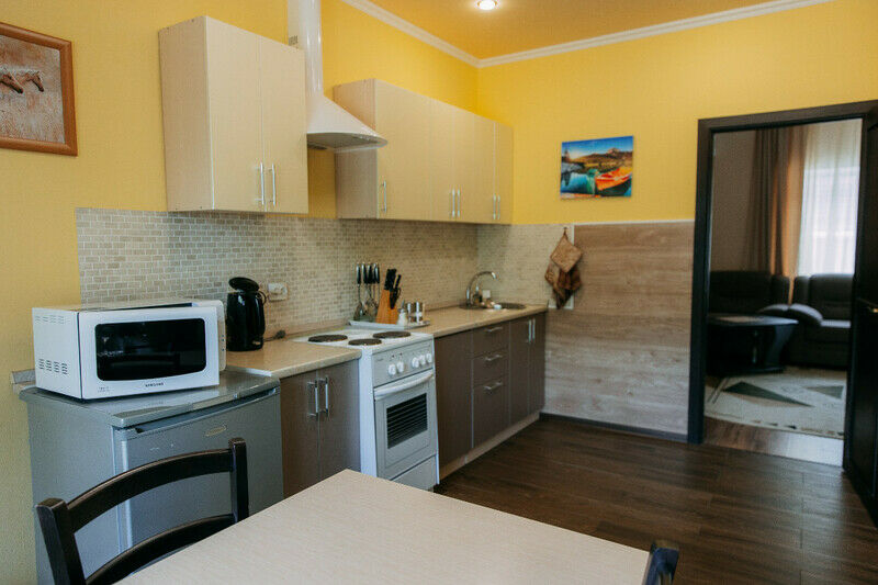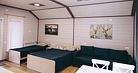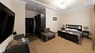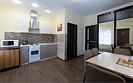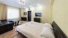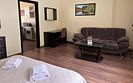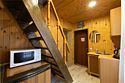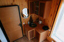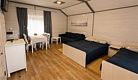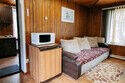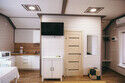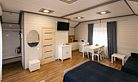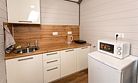 прихожая, гардероб, кухонная зона (стол, плита, духовой шкаф, чайник, СВЧ-печь, холодильник), комната (LCD-телевизор, кровать двухспальная, диван раскладной, комод, журнальный стол), туалетная комната, душ