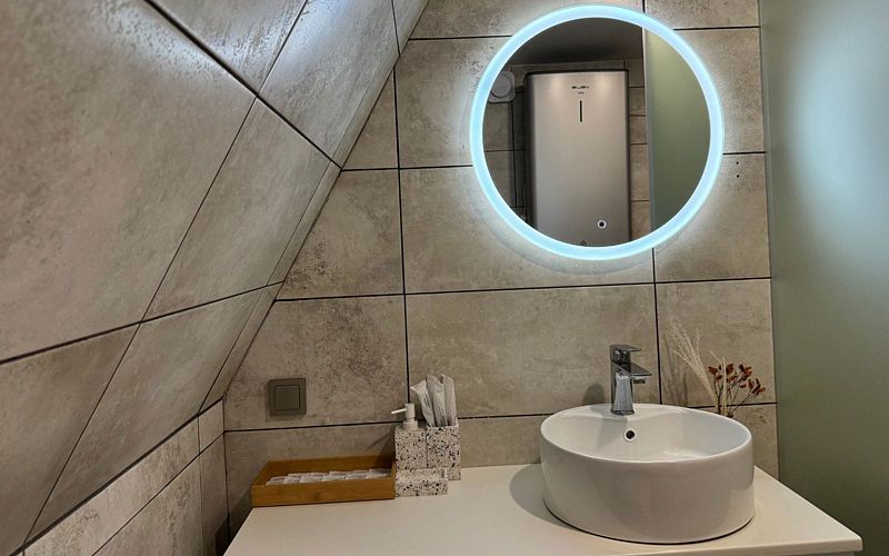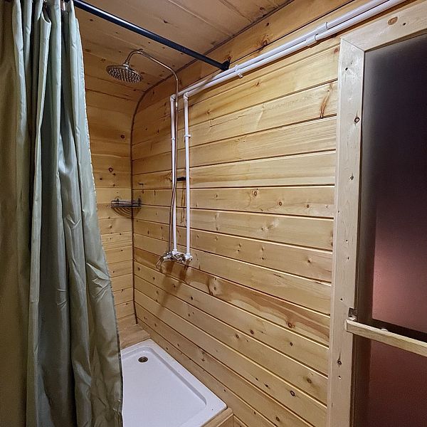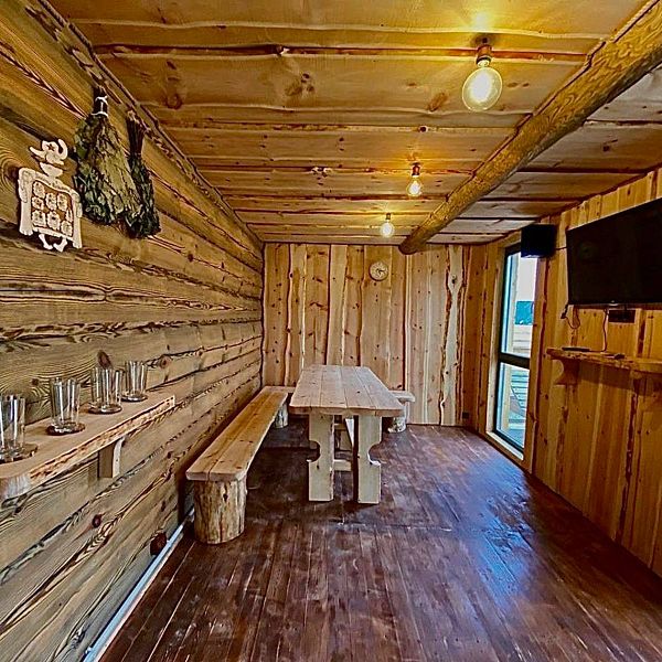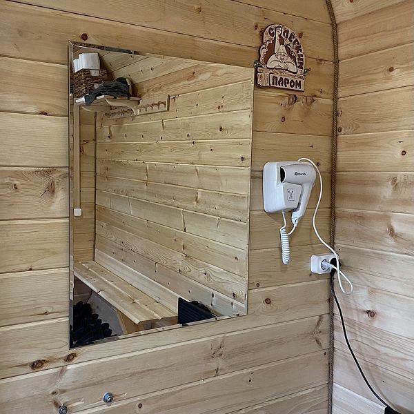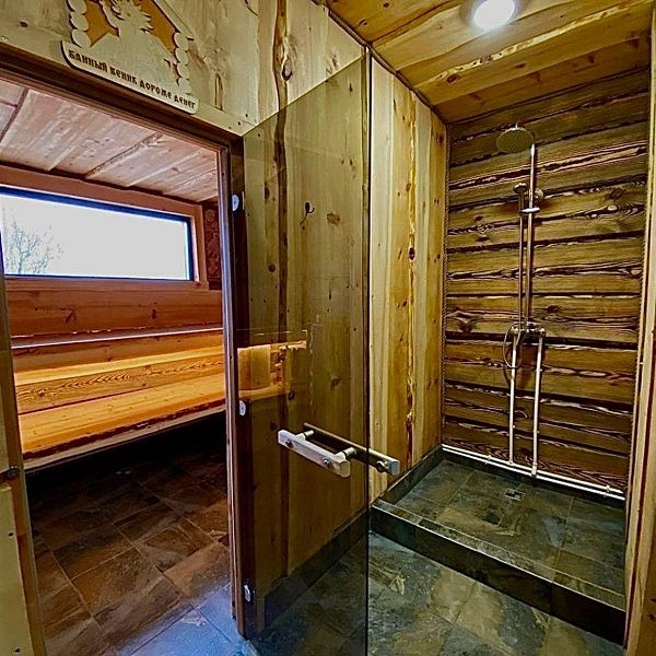 Баня состоит из трех отделений: парной с окном на купель, помывочного отделения с душем и комнаты отдыха, где можно выпить вкусный чай или закуски из кафе «Barhan». Этот уголок уюта и расслабления станет идеальным местом для романтических вечеров и семейного отдыха.