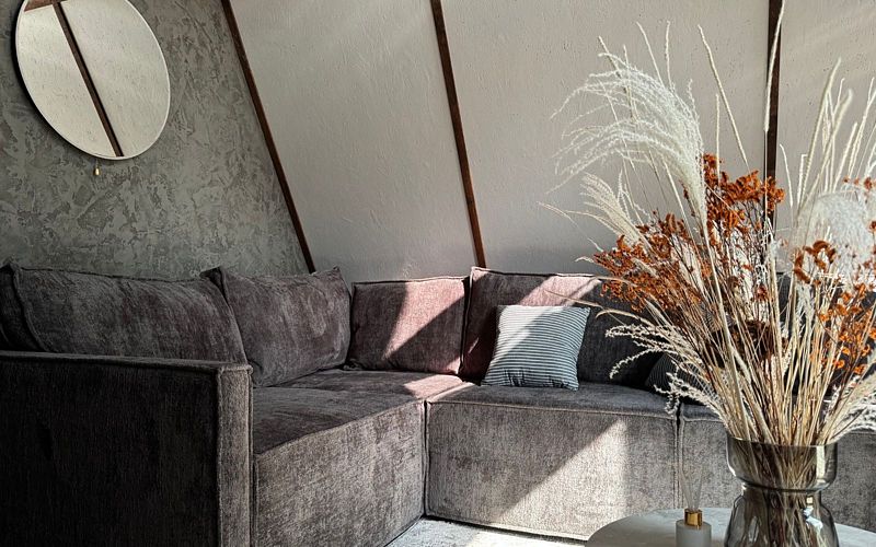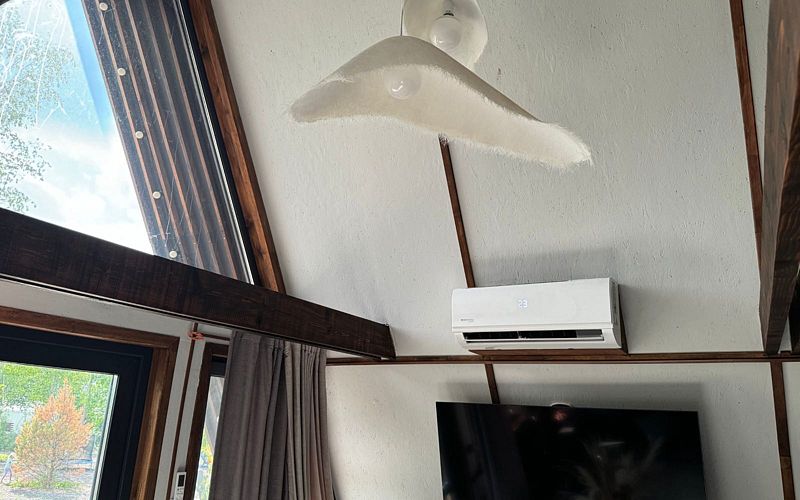 Представляем улучшенный 6-ти местный треугольный дом А-фрейм категории делюкс, площадью 70 м². Этот стильный дом с дизайнерским ремонтом предлагает собственную террасу с деревянной мебелью, идеальную для отдыха на свежем воздухе.