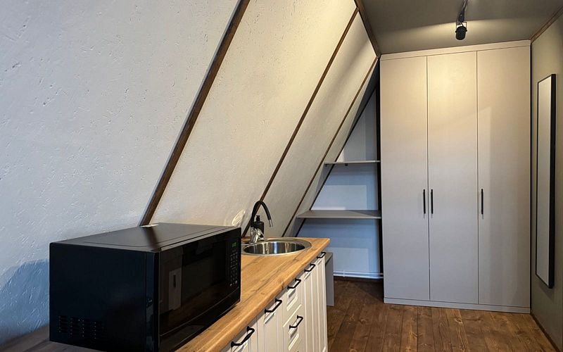 На первом этаже вас ожидает раскладной двухместный диван, двуспальная кровать в отдельной спальне и уютный телевизор для вечерних просмотров. Мини-кухня, оснащенная всем необходимым — холодильником, микроволновой печью, электро-конфоркой (по запросу), чайником и посудой, позволит вам готовить любимые блюда.