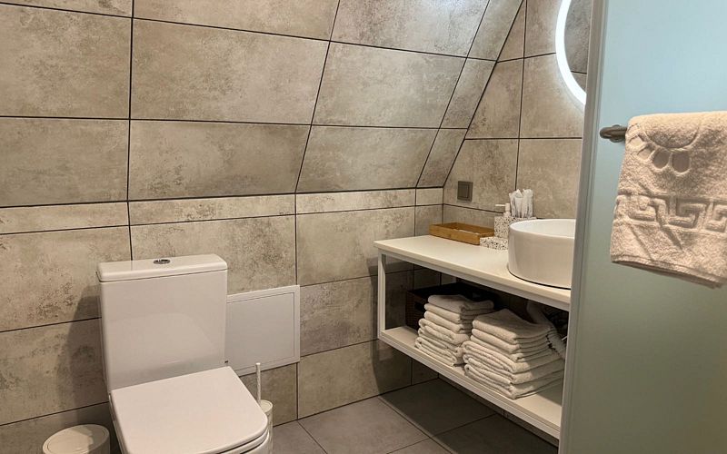 Душ и санузел предоставляют все необходимые принадлежности, включая гель для душа и полотенца. На втором уровне вас ждет еще одна двуспальная кровать, обеспечивая уединение и комфорт для всех гостей.