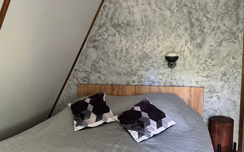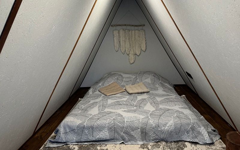 На втором уровне расположена двуспальная кровать, обеспечивая пространство для отдыха и уединения. Этот дом станет отличным выбором для комфортного семейного отпуска.