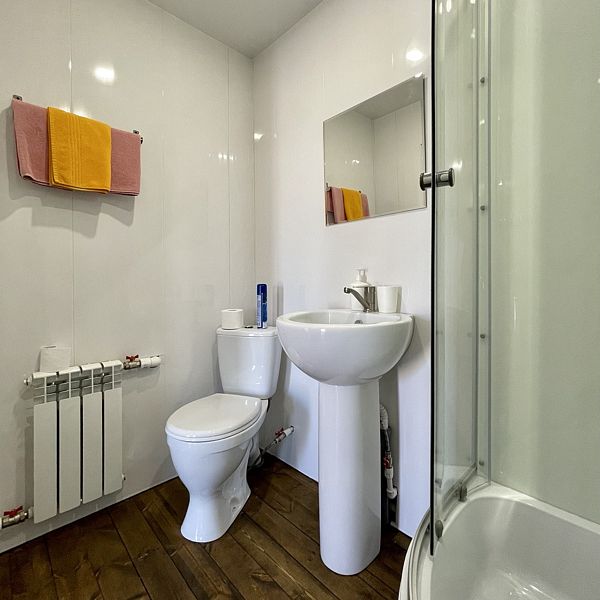 На первом этаже вас встретит раскладной двухместный диван и современный телевизор, создавая атмосферу уюта и удобства. Мини-кухня, оснащенная холодильником, варочной панелью и чайником, предоставляет все необходимое для приготовления любимых блюд. Душ и санузел оборудованы всеми нужными принадлежностями — от геля для душа до полотенец.
