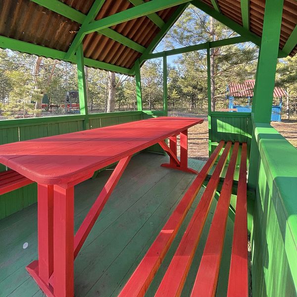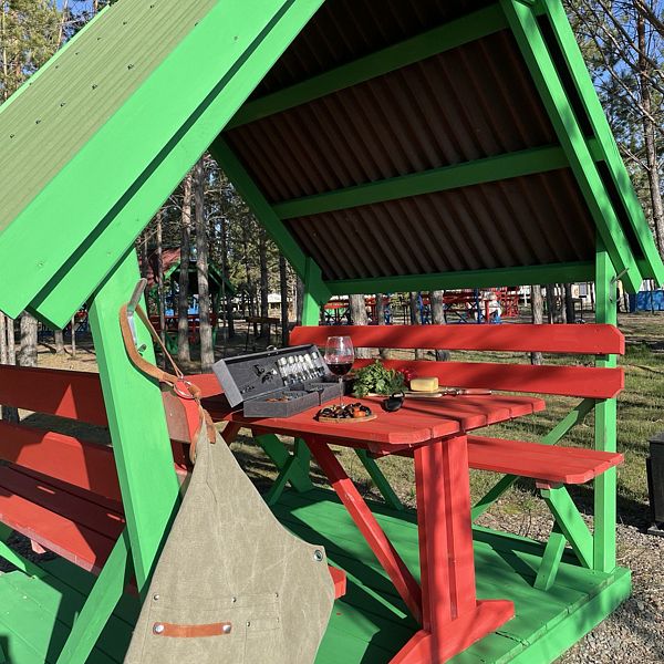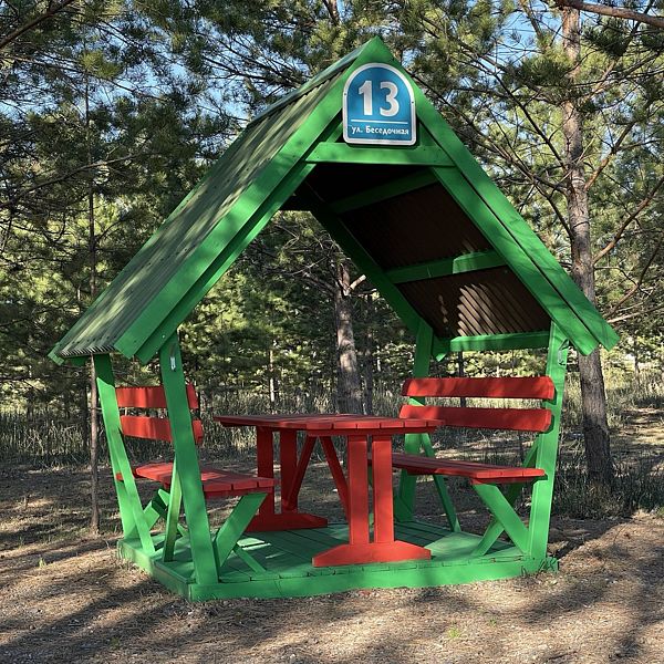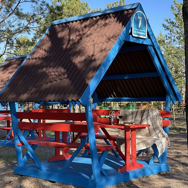 Каждая беседка пронумерована, оснащение включает две скамейки, удобный стол и мангал для вашего барбекю. По необходимости предоставляются шампура и решетки под залог, чтобы ваш отдых был максимально комфортным и незабываемым.