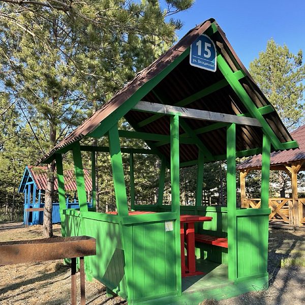 Здесь предусмотрены все комфортные условия для вашего отдыха: две скамейки, удобный стол, диван, мойка и чайник, а также бесплатное пользование мангалом и закрытой территорией с качелями и детским городком. Удобное расположение рядом с уличным туалетом делает ваше пребывание еще более комфортным.