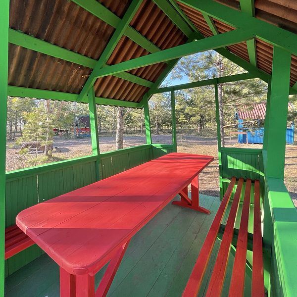 Средняя беседка — отличный выбор для компаний до 12 человек, идеально подходящая для дружеских встреч и веселых мероприятий. Уютно расположенная в сосновом лесу с живописным видом на озеро, беседка обеспечивает комфорт и уединение, благодаря достаточному расстоянию между соседними площадками.