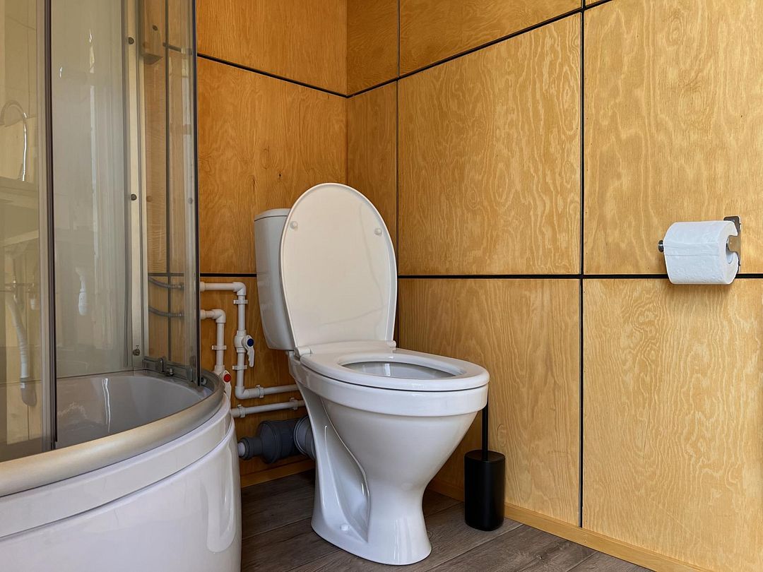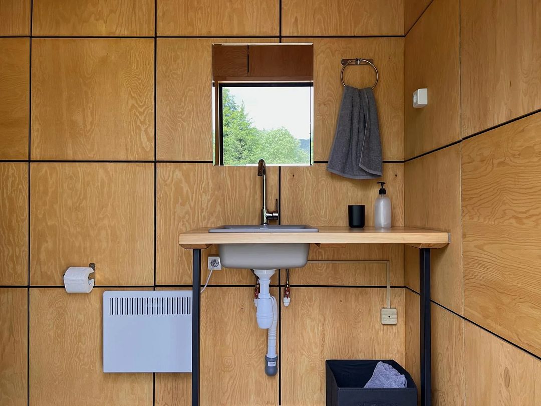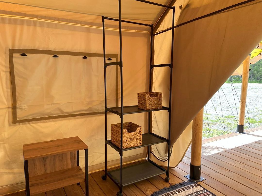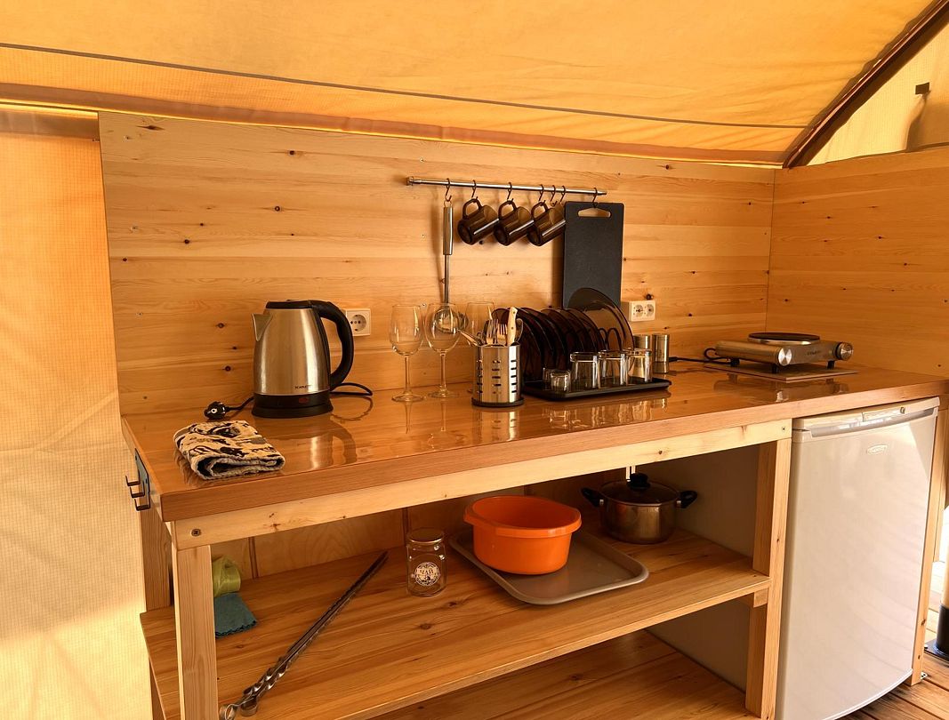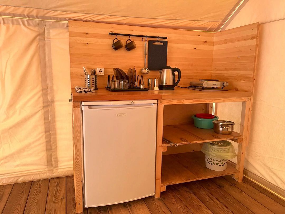 Глэмпинг оснащен небольшой кухонной зоной с мини-плитой, холодильником, чайником и набором посуды. Санузел с душем находятся в отдельном блоке