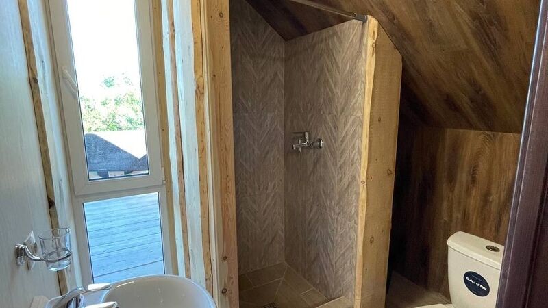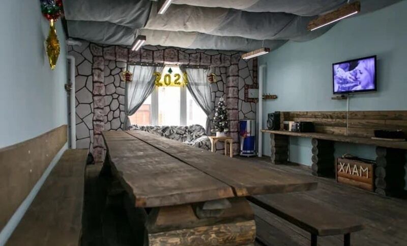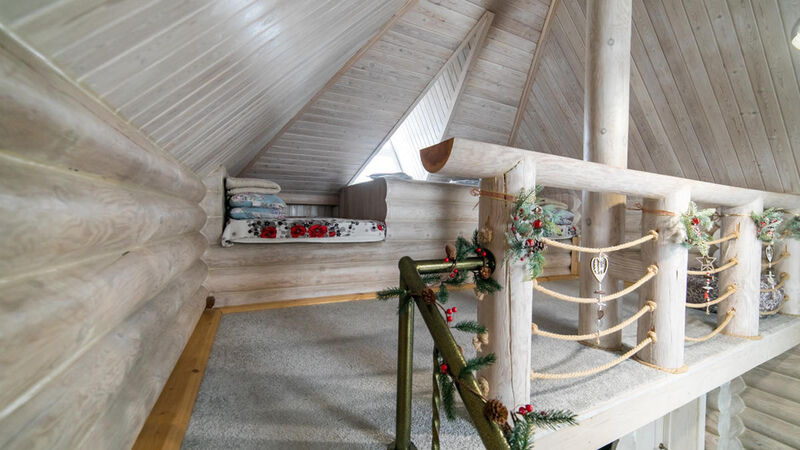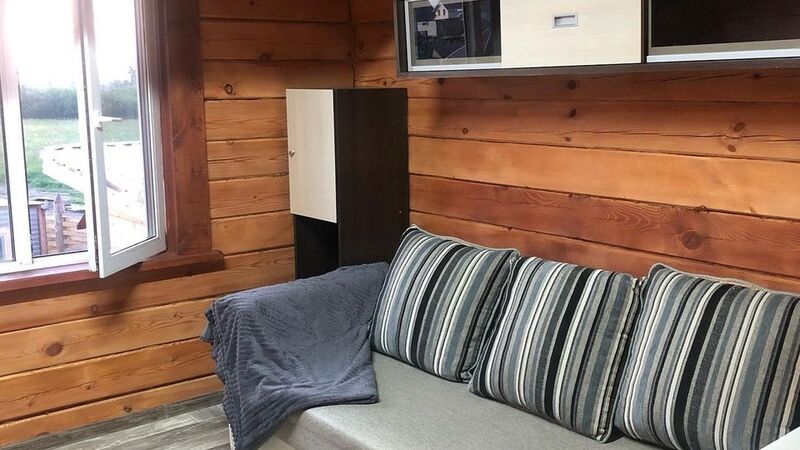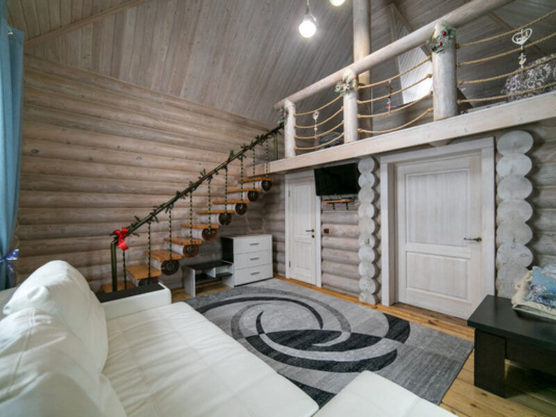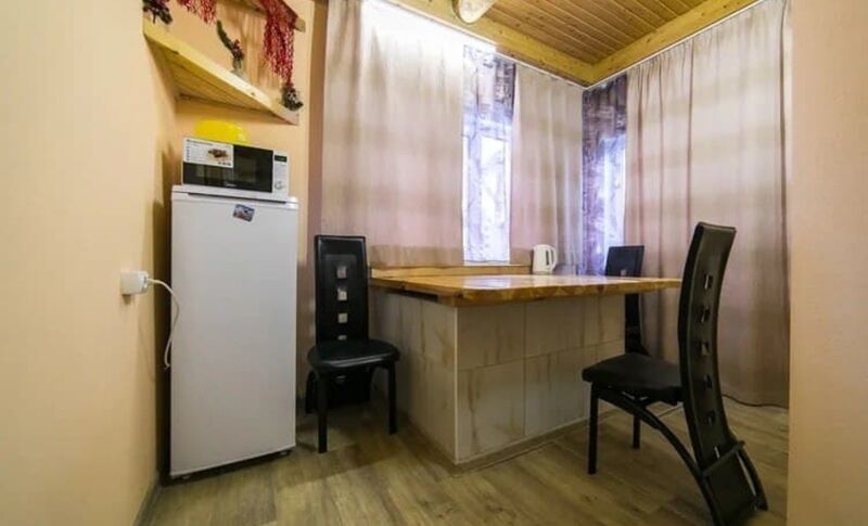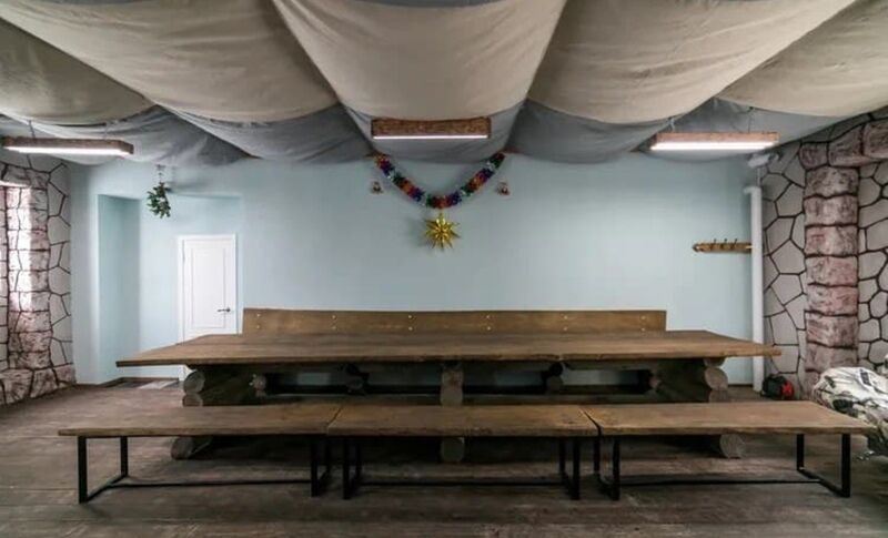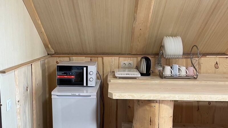 Внутри есть туалет с раковиной, кухня с раковиной, диван, стол 5 м с лавочками по всей длине с обеих сторон, телевизор, музыкальная колонка, микроволновая печь, барбекю для приготовления пищи. Действует круглогодично.