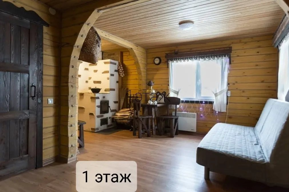 На 1 этаже диван, дровяная печь с варочной поверхностью, холодильник, телевизор, чайник, плита электрическая одноконфорочная, набор посуды, в санузле холодная и горячая вода, мыло, полотенце для рук, туалетная бумага, душевая кабина.