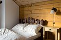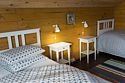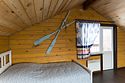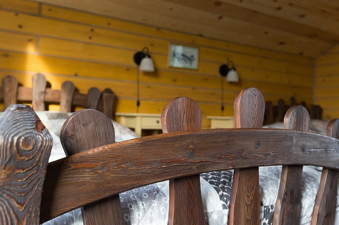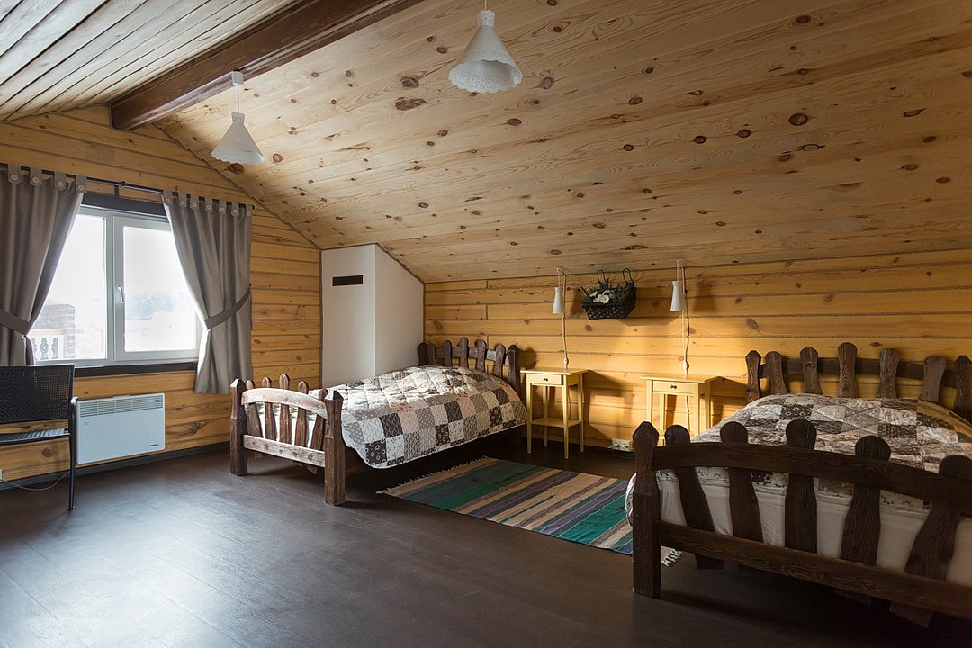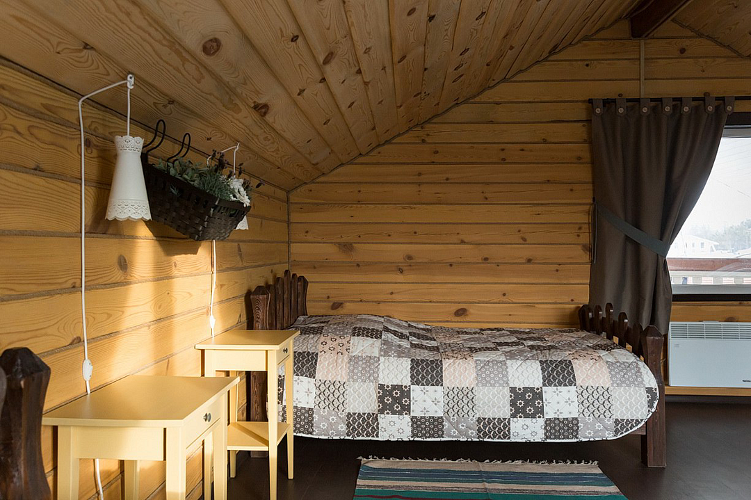 На 2-ом этаже 2 кровати с прикроватными тумбочками, столик и два кресла.