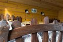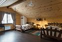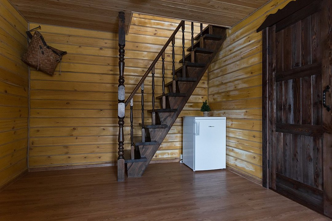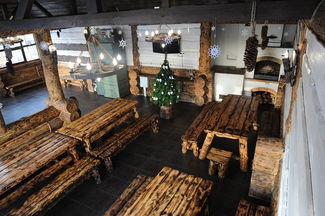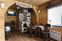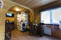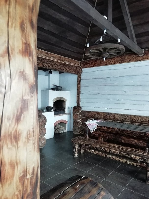 На первом этаже диван, стол с лавочками, печь для приготовления шашлыка, чайник, кружки, телевизор. На втором этаже просторная комната отдыха с бильярдом.